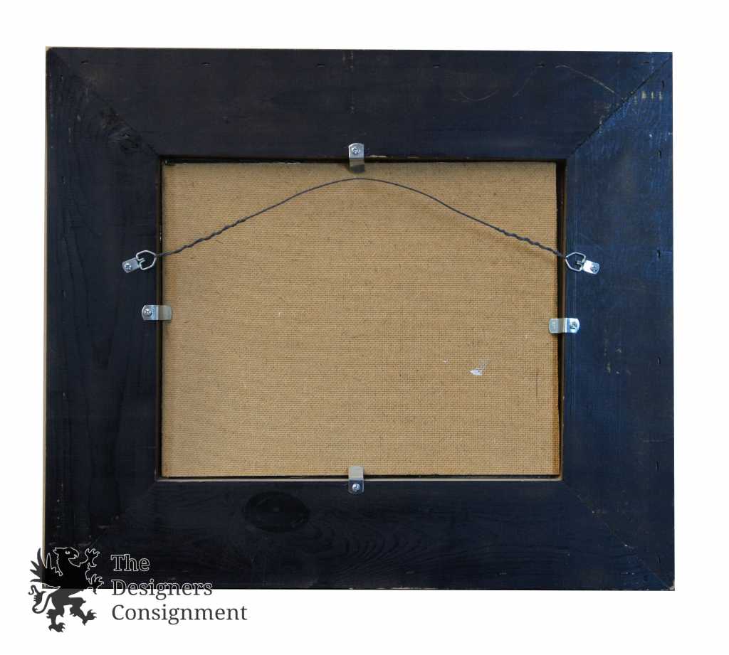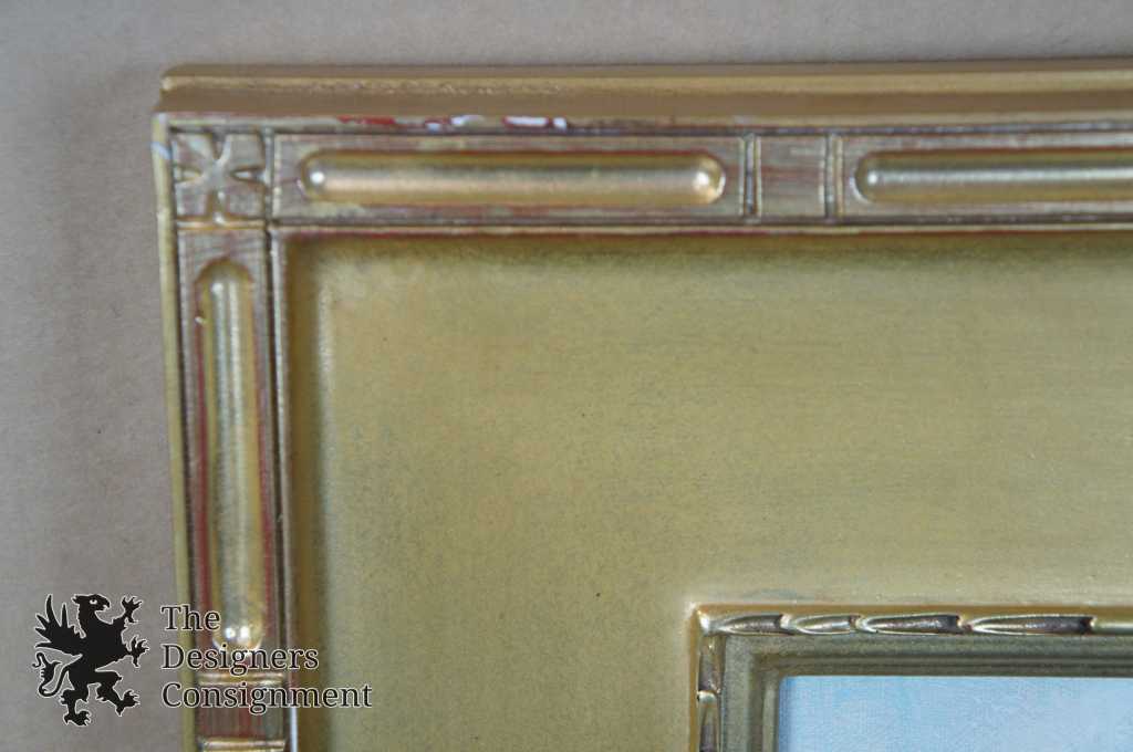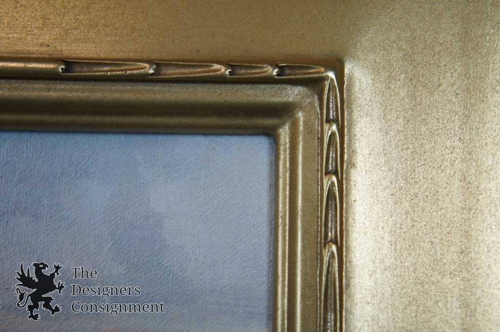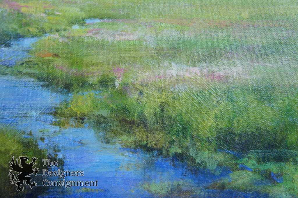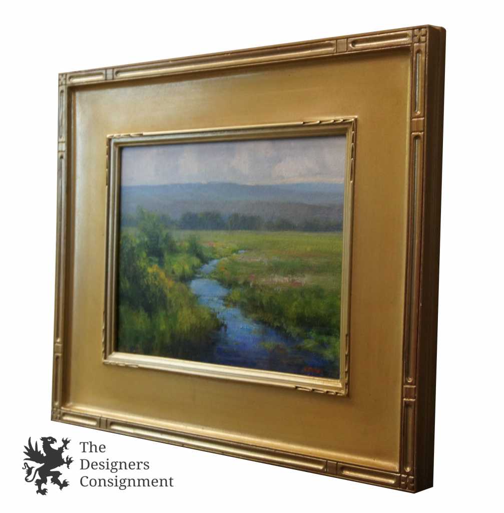 This lovely oil painting shows a valley view creek-side. luscious greens and blues on a cloudy day. The rocky mountains can be seen in the background. A canvas painting, signed lower right. Framed in an elegant gold design.