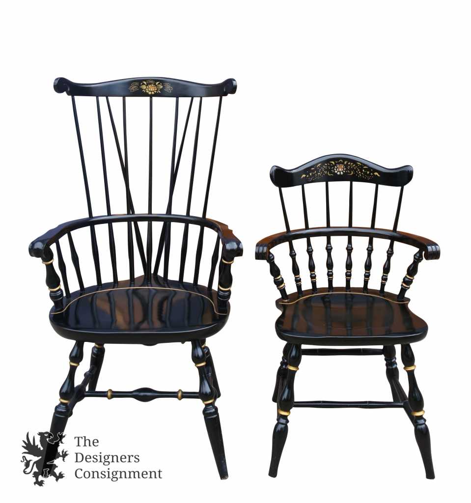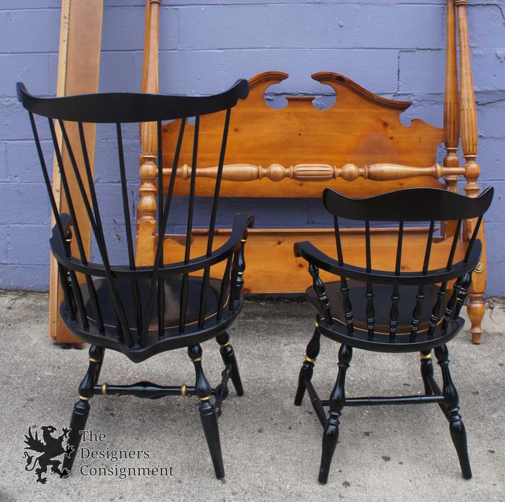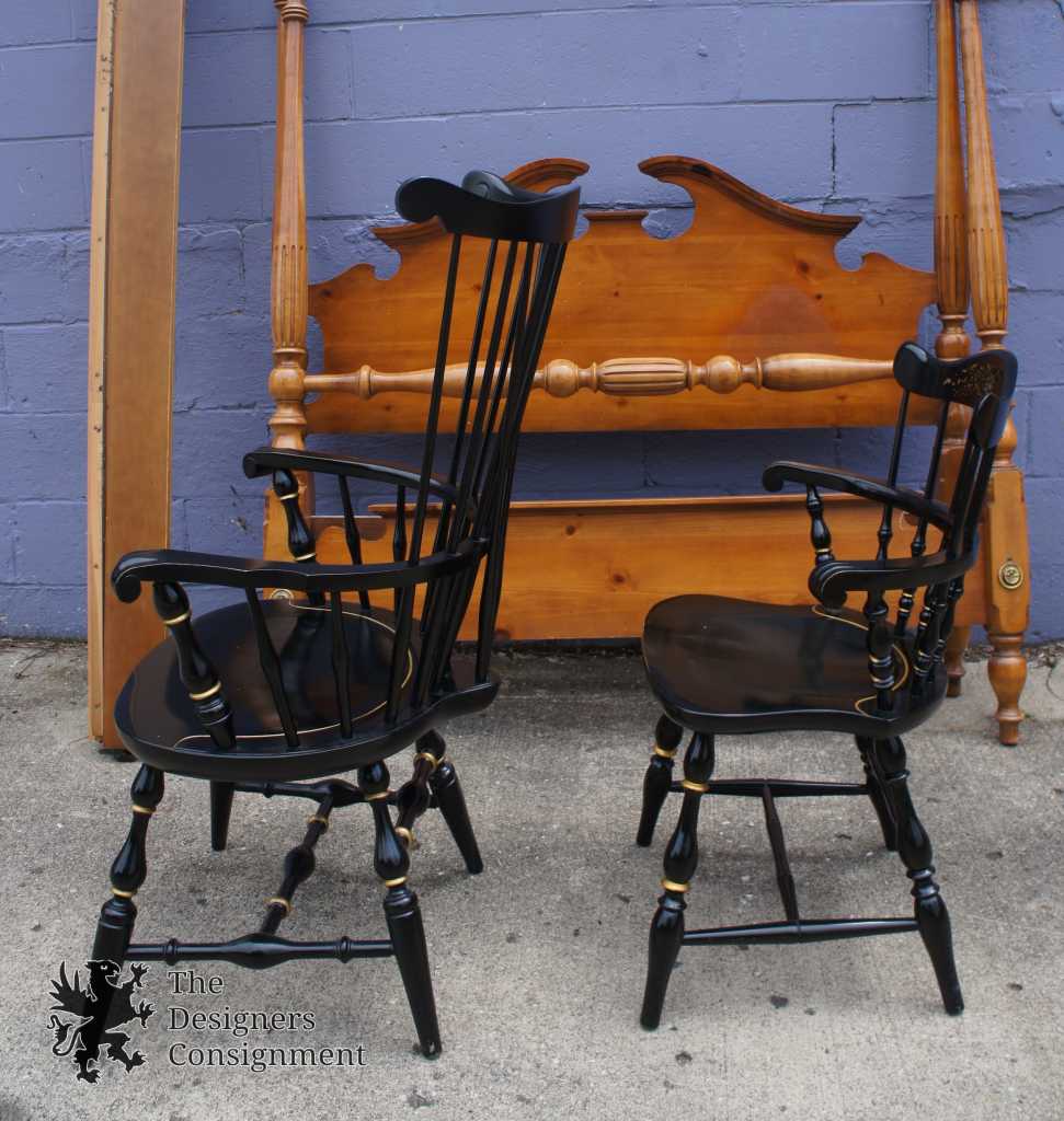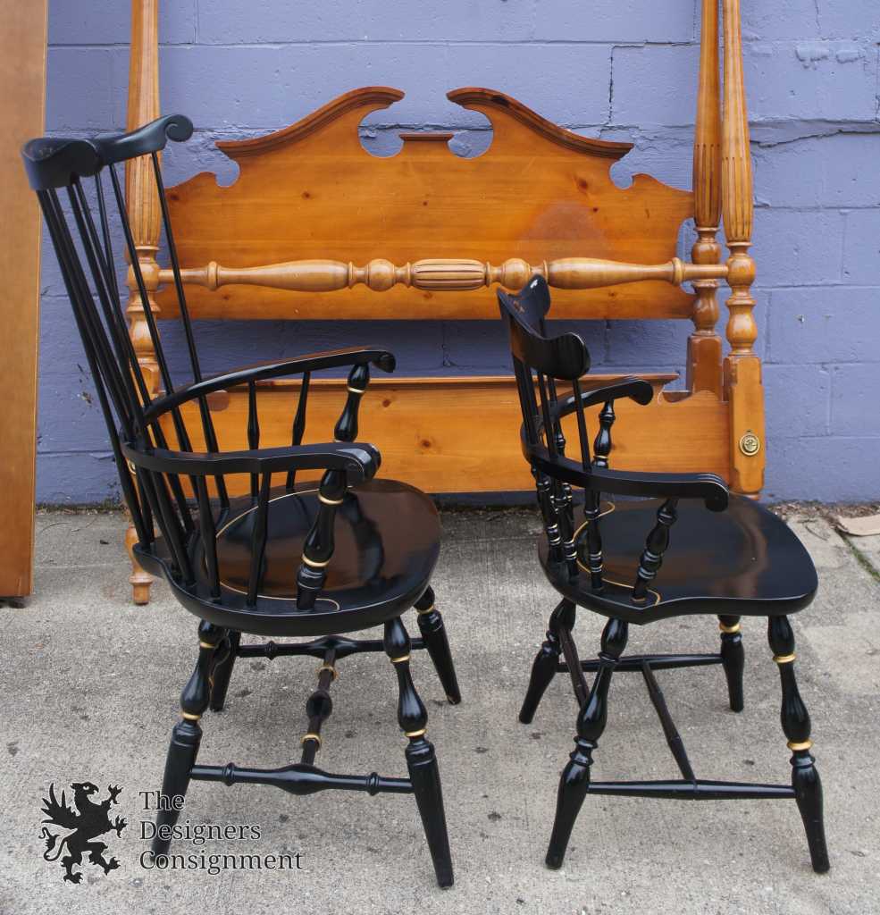 2 Nichols & Stone Co. harvest harvest stenciled Windsor chairs. Beautifully designed with a black finish trimmed in gold. A neat accent in any setting.