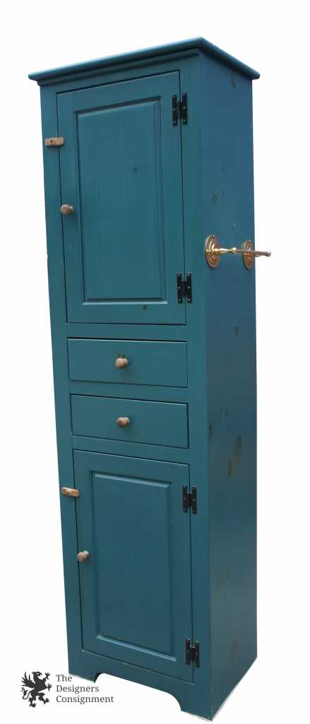 This beautiful linen cabinet is from their Mastercraft line which was all pine furniture. Manufactured in the latter half of the 20th century. The cabinet is a green color with naturallatches and pulls. There are towels bars along the left and right side. Both central drawers are dovetailed and the makers mark is stamped along the back.