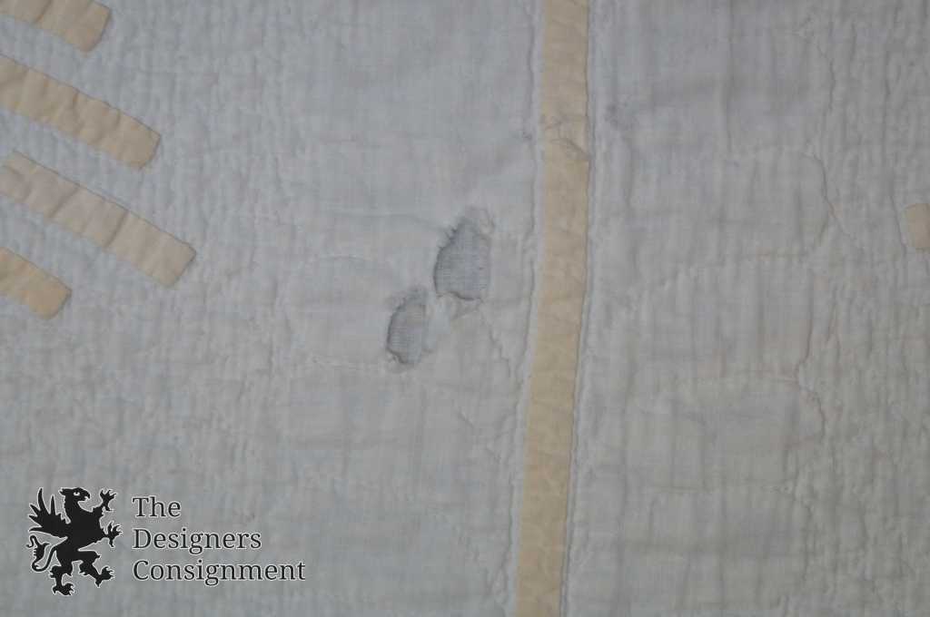 Features a white field with applique red star pattern with yellow sunbursts and accents