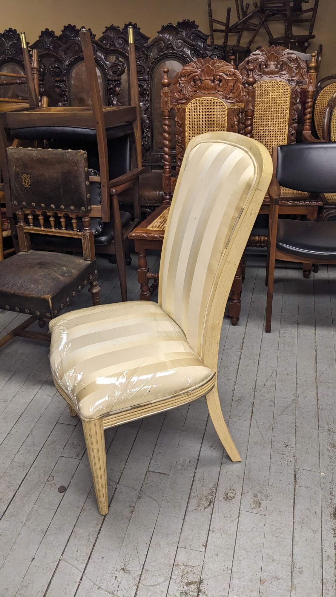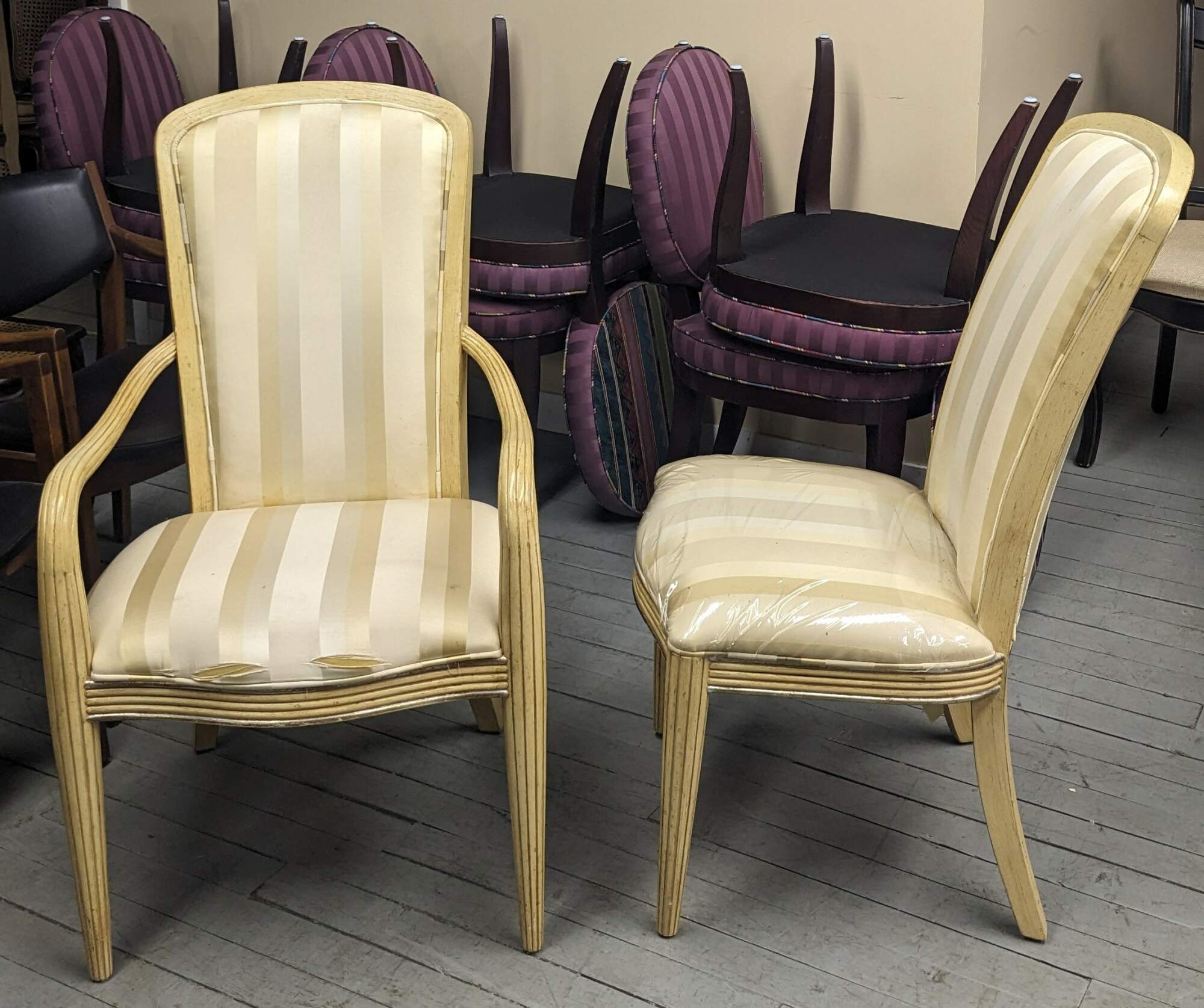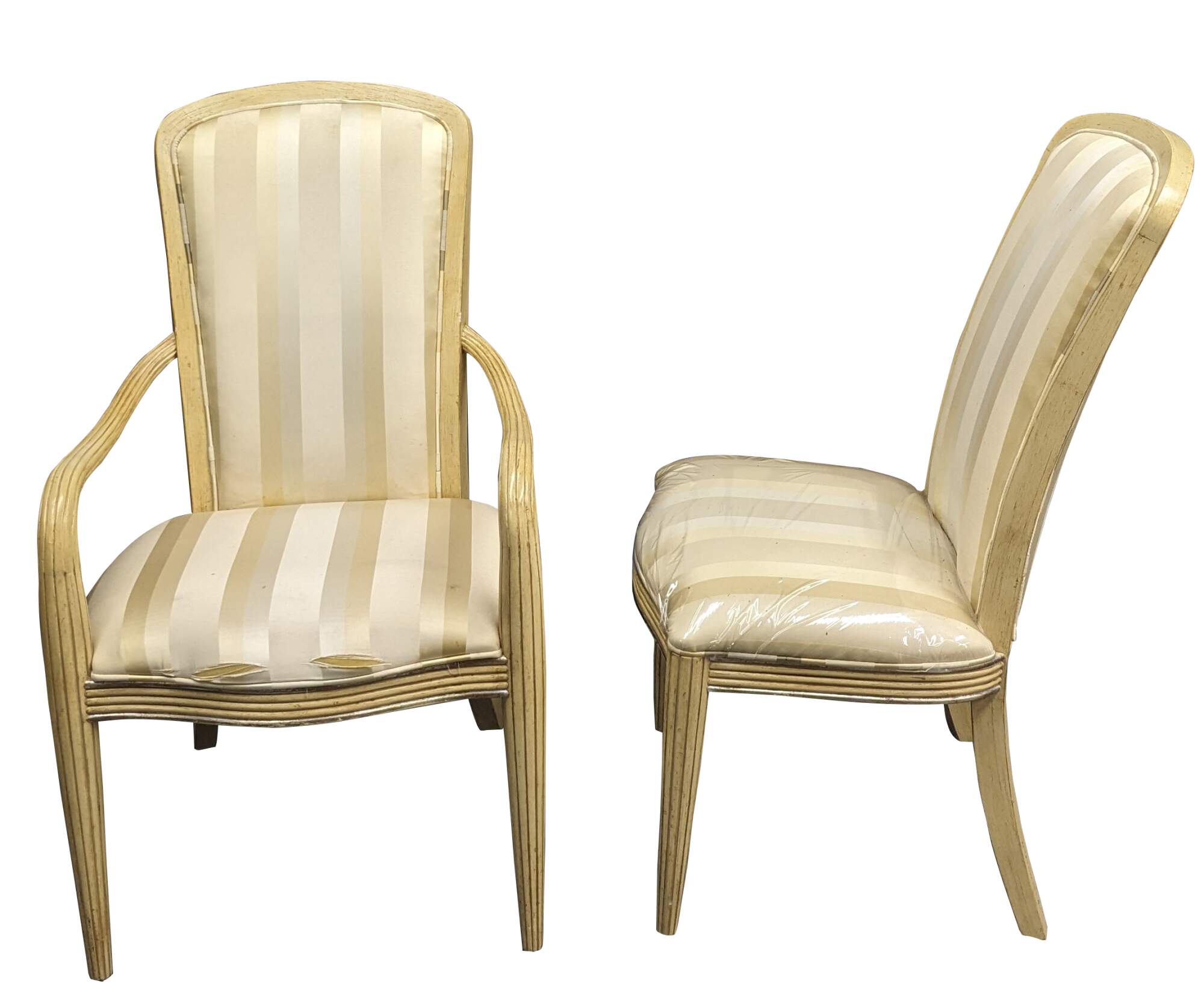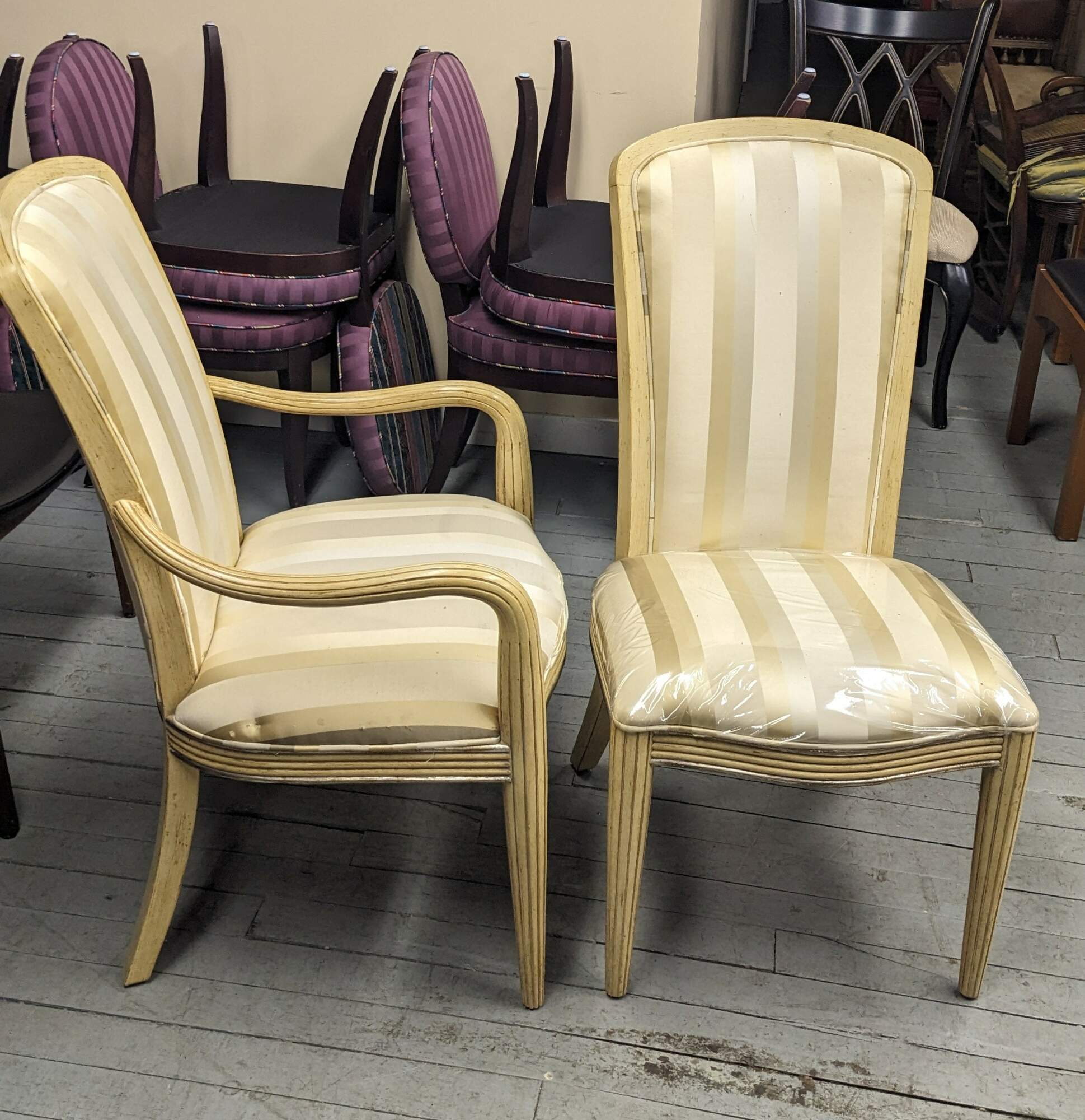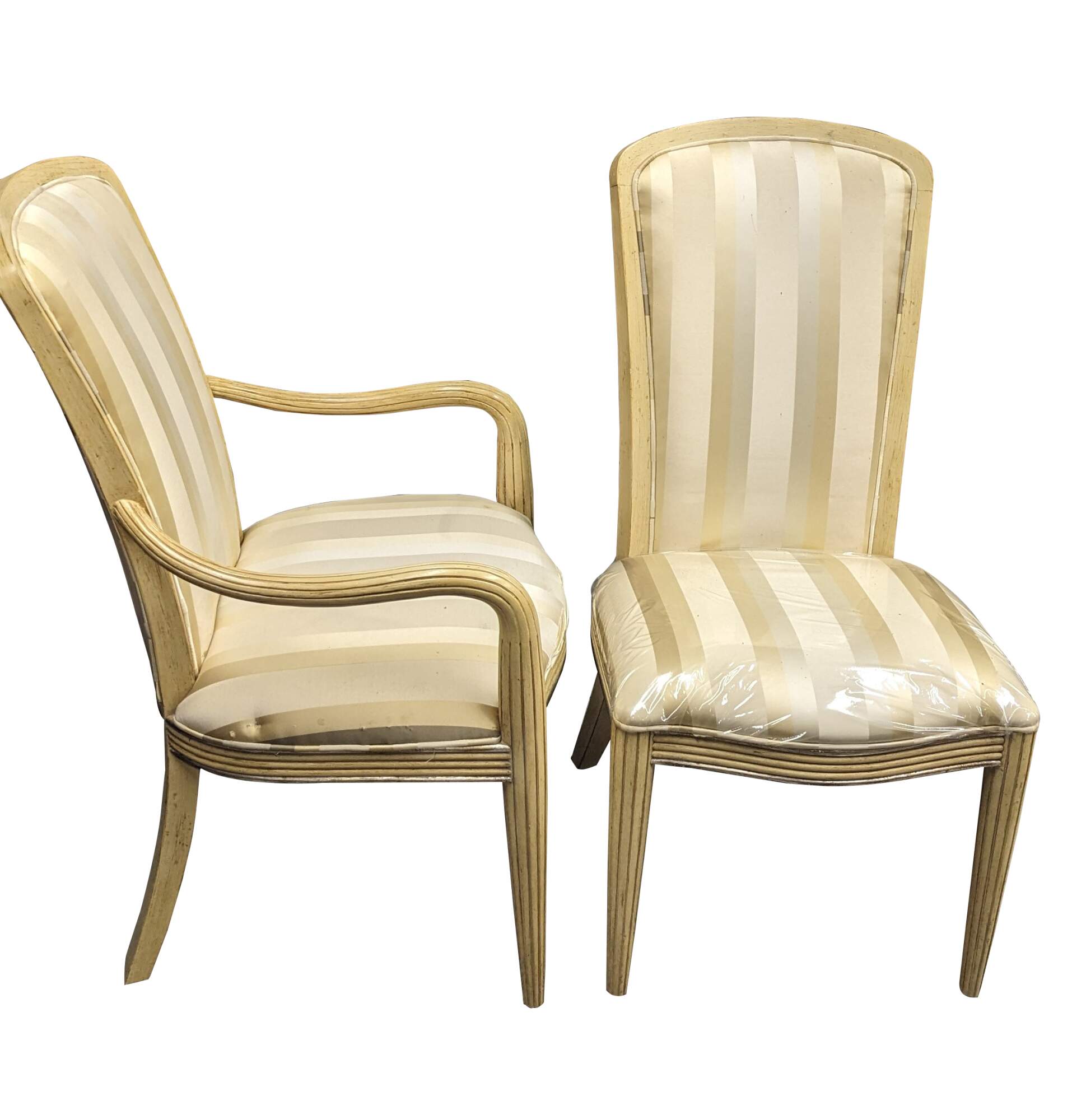 Set of six Century Furniture pickled oak dining chairs. Features a striped upholstery and ribbed frame.