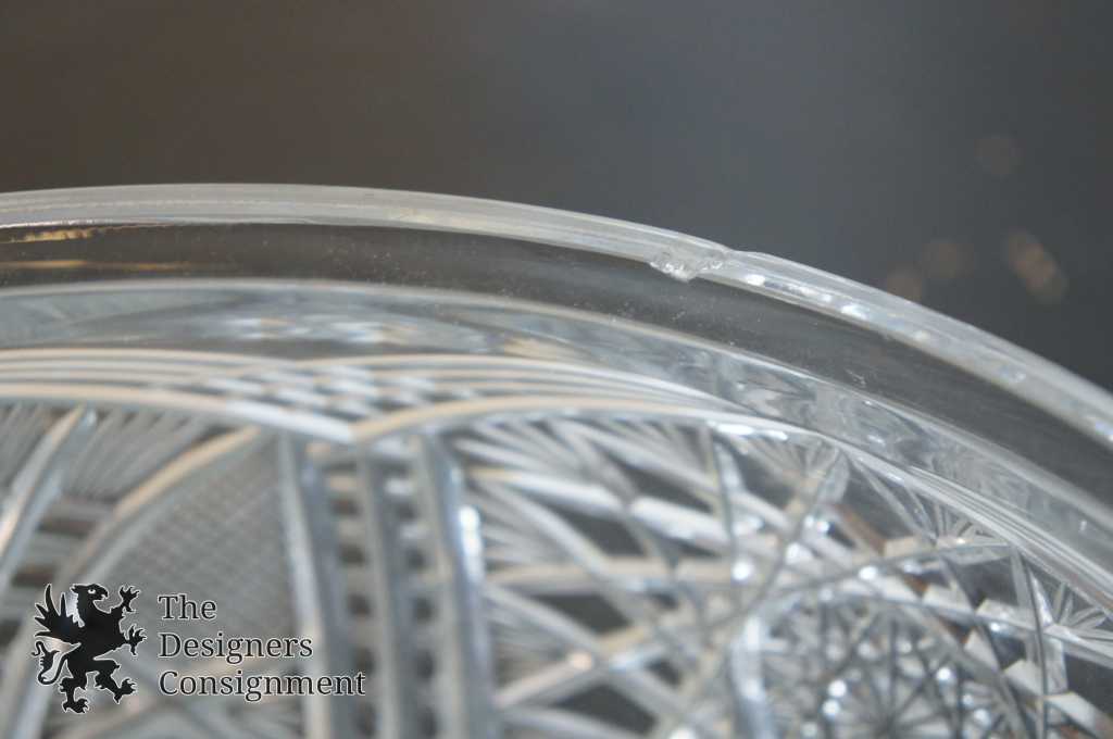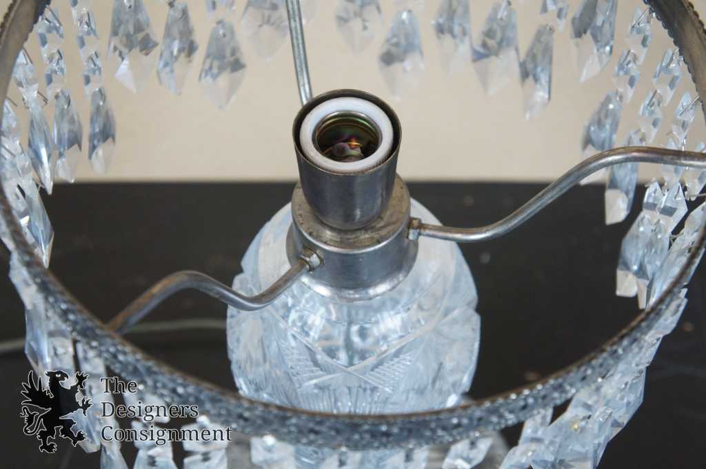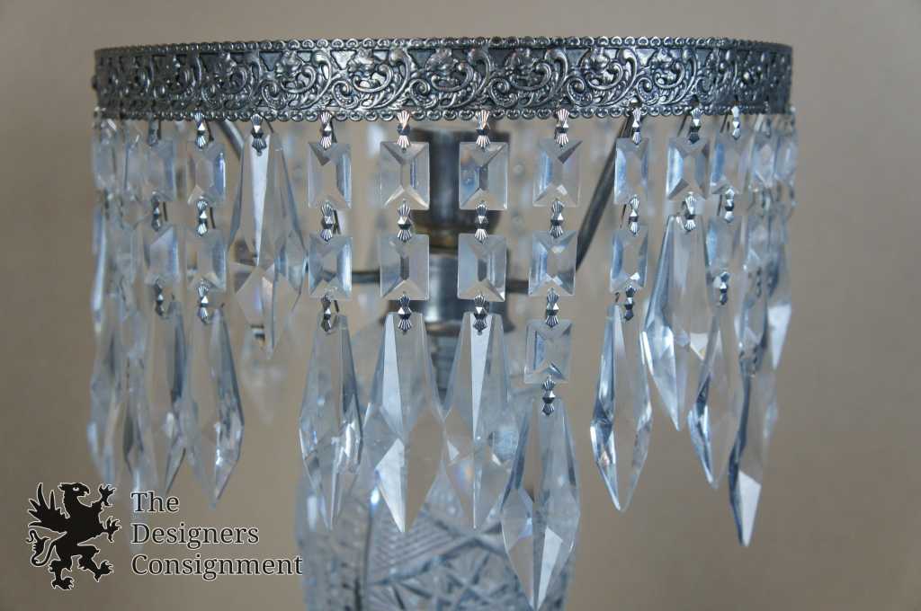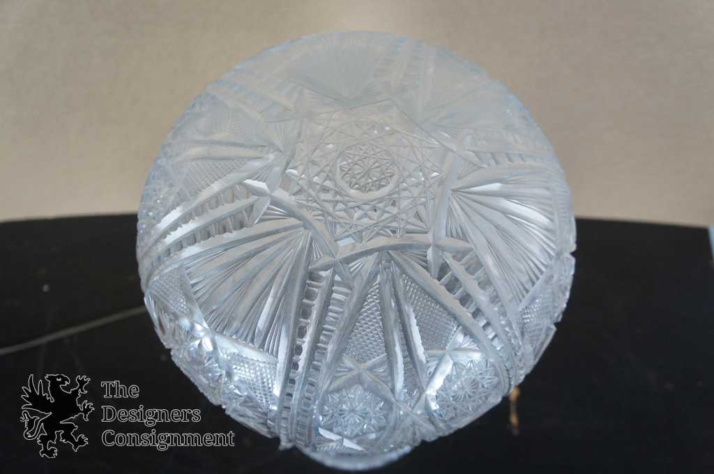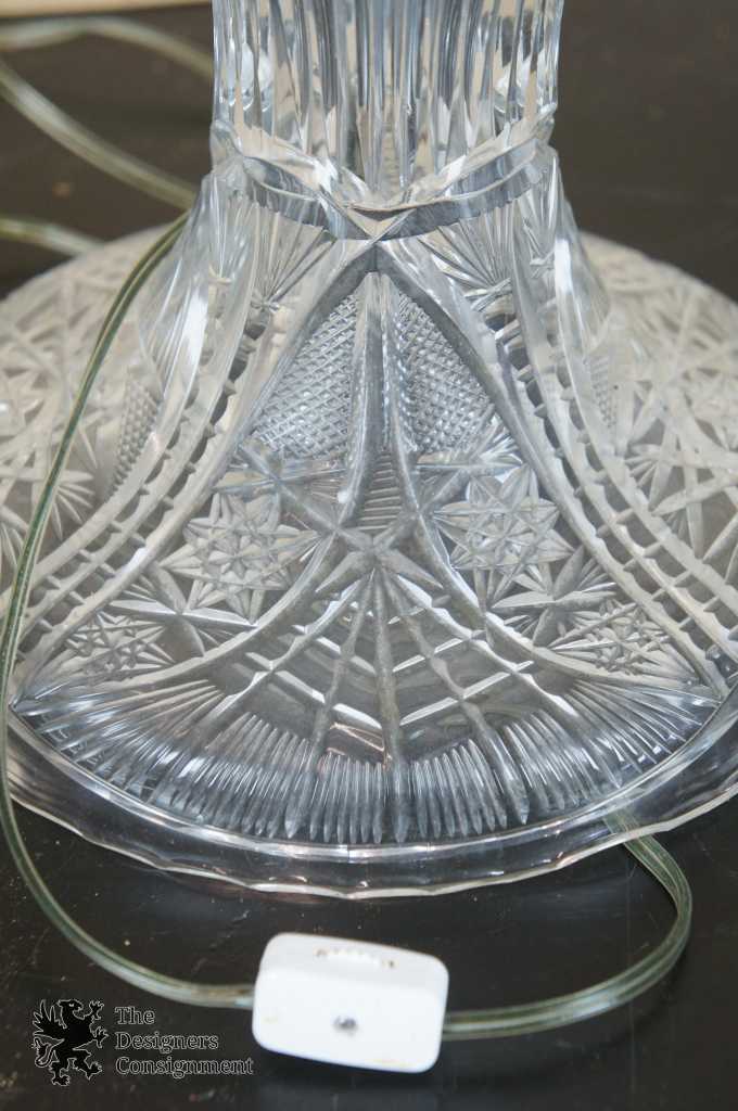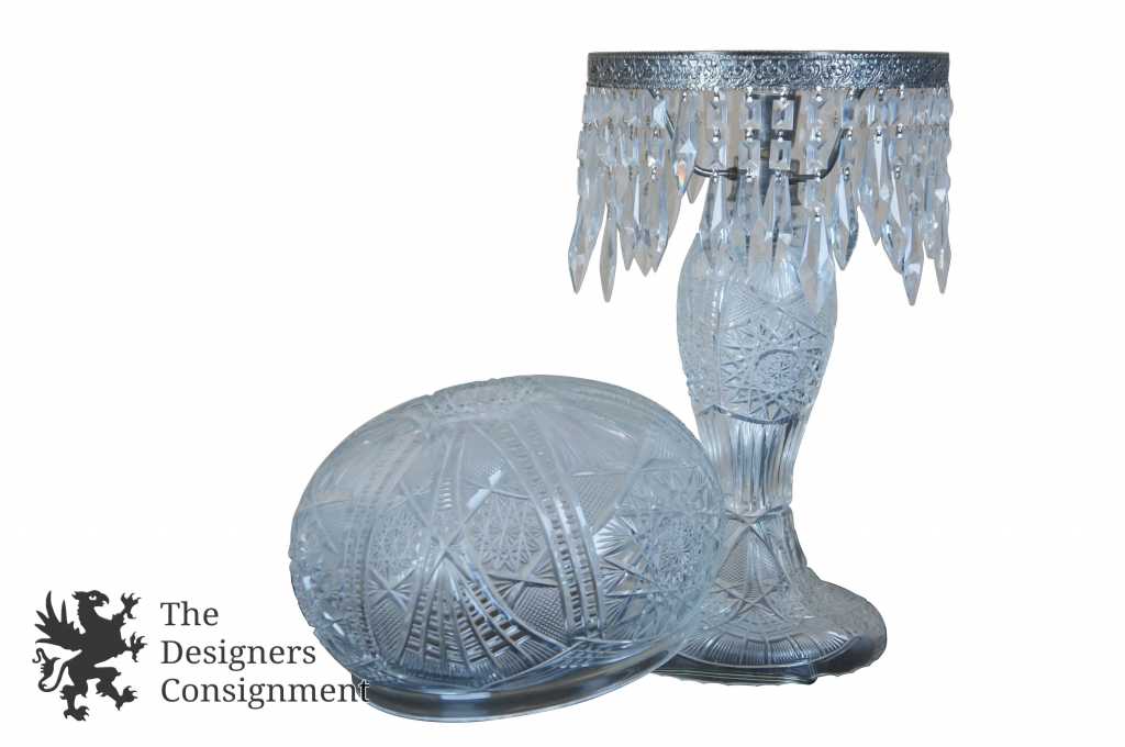 Monumental American Brilliant Cut Period Mushroom Lamp. Beautifully designed with a large dome leading to an embossed metal ridge lined with a gallery of prisms. The glass has thick cuts with pinwheels throughout. Light is switched via cord. A glowing compliment to any setting.