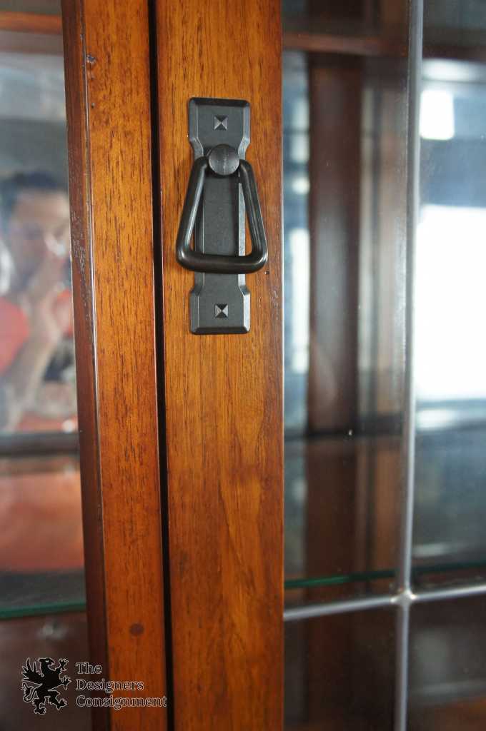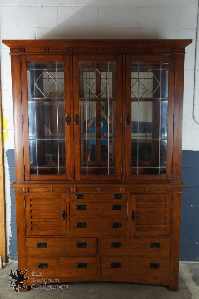 An impressive Mission inspired buffet & hutch. With seven drawers and two lower cabinet there's a plethora of space for storage. Hutch features a leaded glass front, glass shelves and mirrored backing. Finished in Spanish Oak. Purchased in 2007.