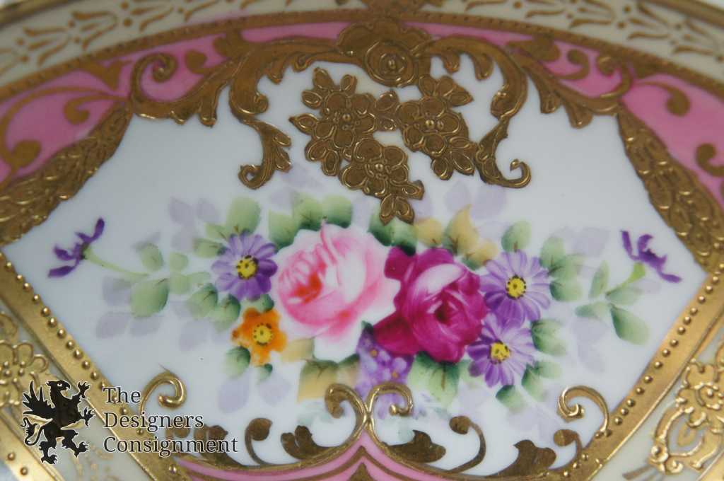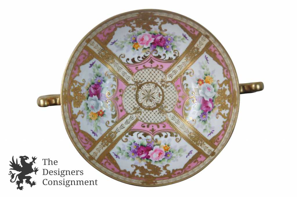 Noritake footed compote. Pink with floral design and beautifully painted gold interior. Marked in green along the bottom in the cherry blossom mark. This mark was used by Noritake from 1924-1935