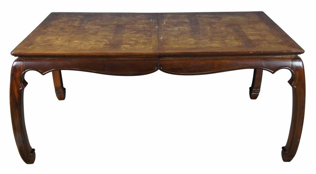 Universal Furniture Ming style dining table. Finished in Mahogany with a burled ash top. Reminiscent of Century Furniture's Chin Hua Collection. Includes 2 original leafs and a wooden panel that was made to allow for larger settings.