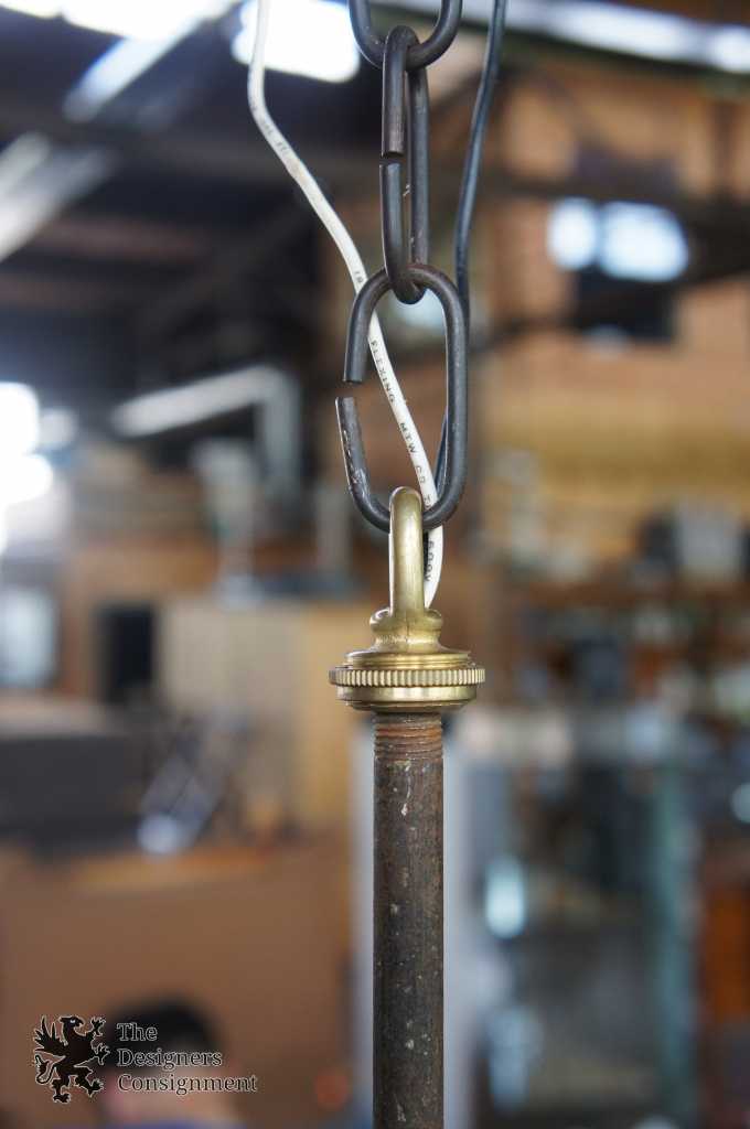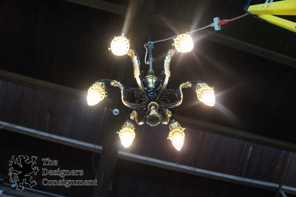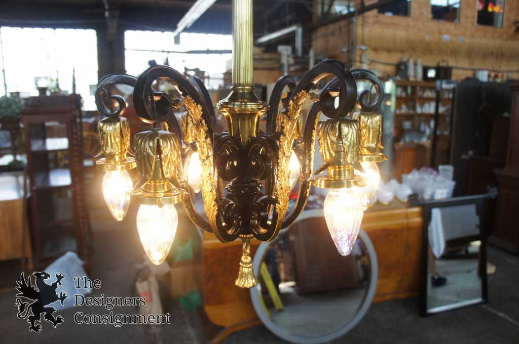 French Empire 6 light drop chandelier. Heavy cast iron with bronze and brass accents. Black base with gold trim. Shades could be added