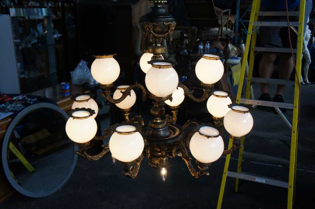 Monumental French Empire style 16 light, two tone bronze chandelier. Beautifully designed with twelve cast acanthus arms, acorn finials and globe lights. Northwind faces ordain the top and the bottom is perfectly illuminated by 4 down lights that glow upon an elaborate 6 petal flower. An irresistible light adding grandeur to any space.