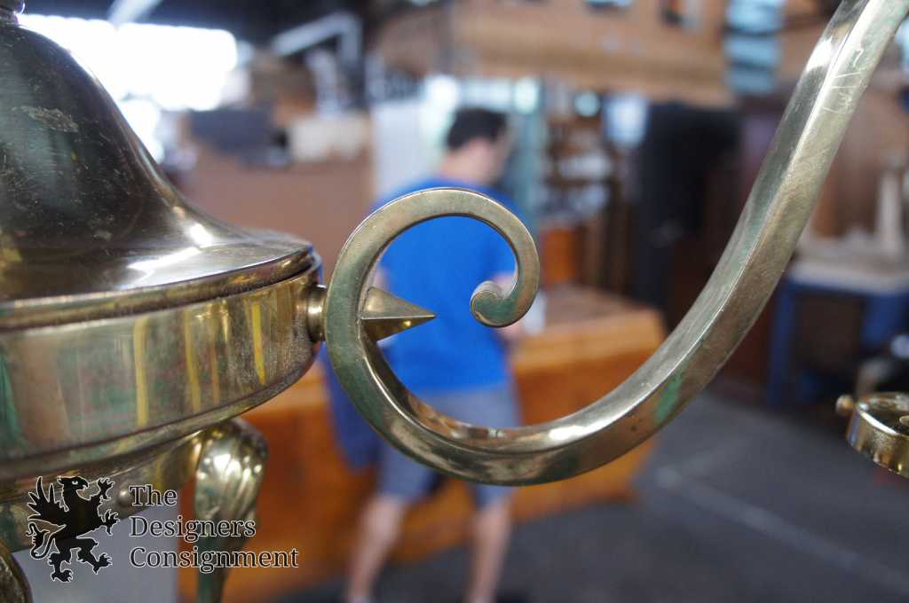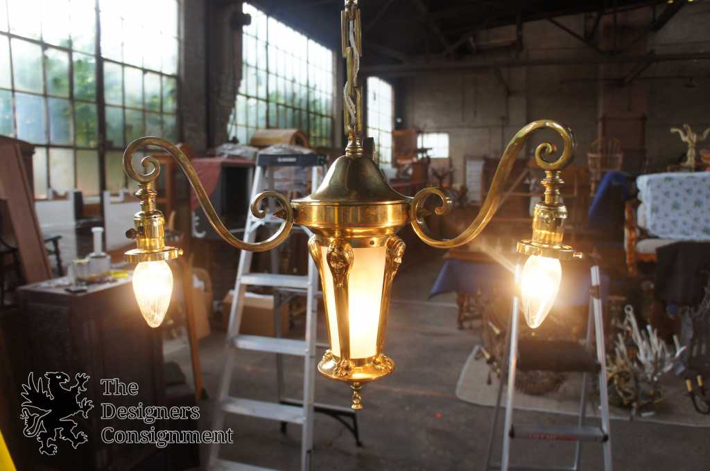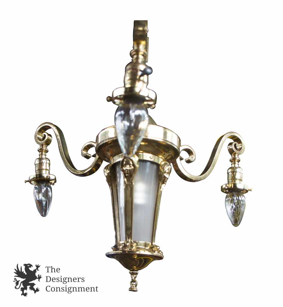 Egyptian Revival three arm chandelier with illuminated center. At the center is a tapered glass cover placed inside of intricately designed sphinx figures. Each outer light can be illuminated via switch. Globes or torchieres can be added.