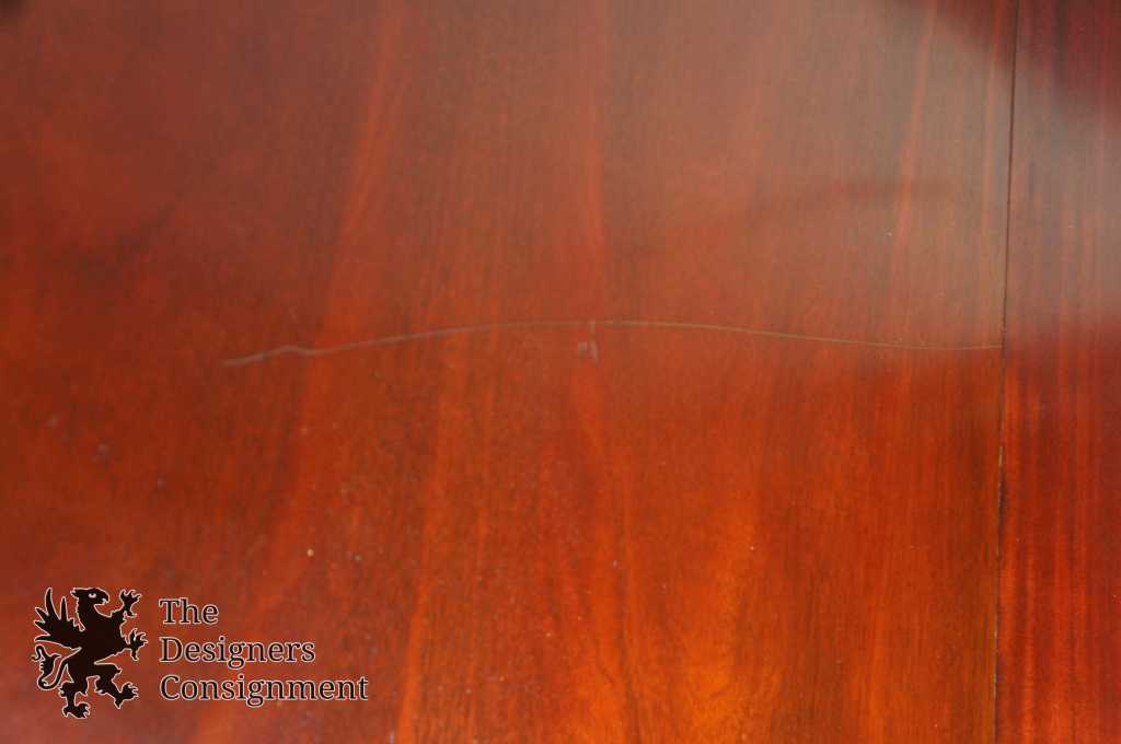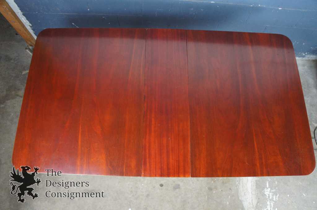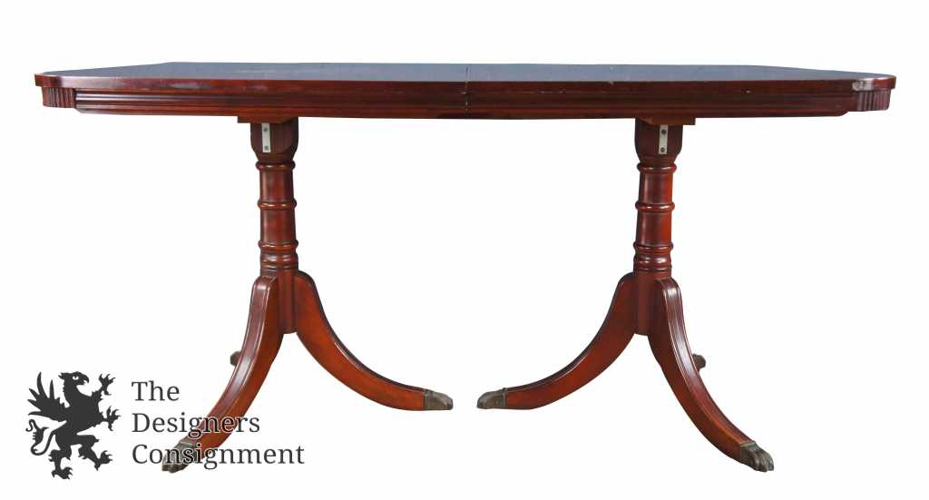 A quaint dining table by Lexington Chair Co. Made from Mahogany with a double pedestal base showing claw feet. Includes one leaf. The table has a narrow apron with rounded and fluted corners. A fun size thats great for kitchens and smaller dining areas.