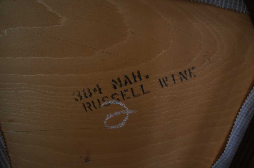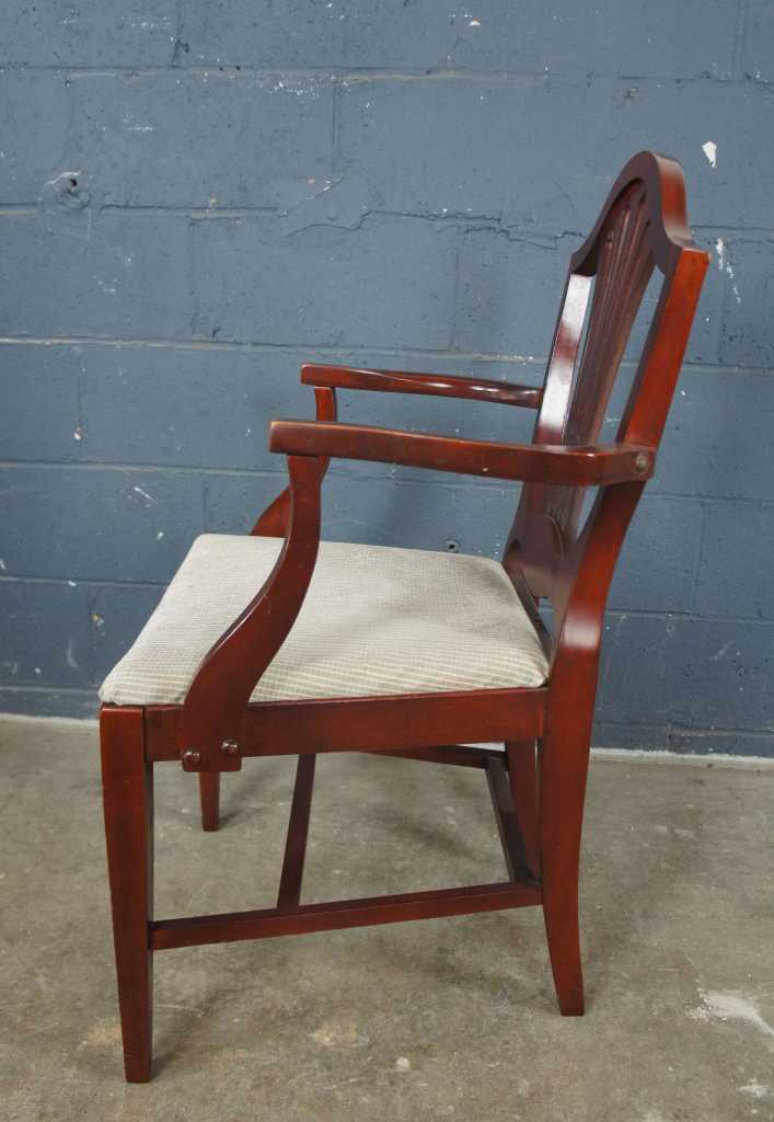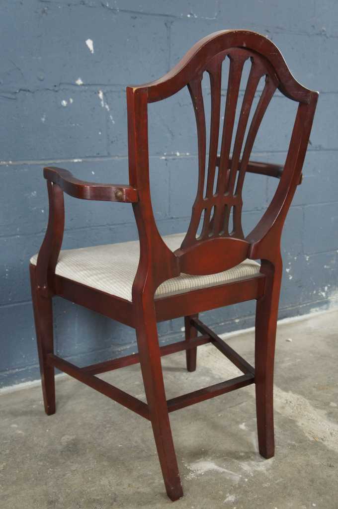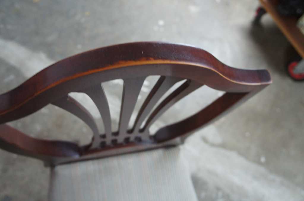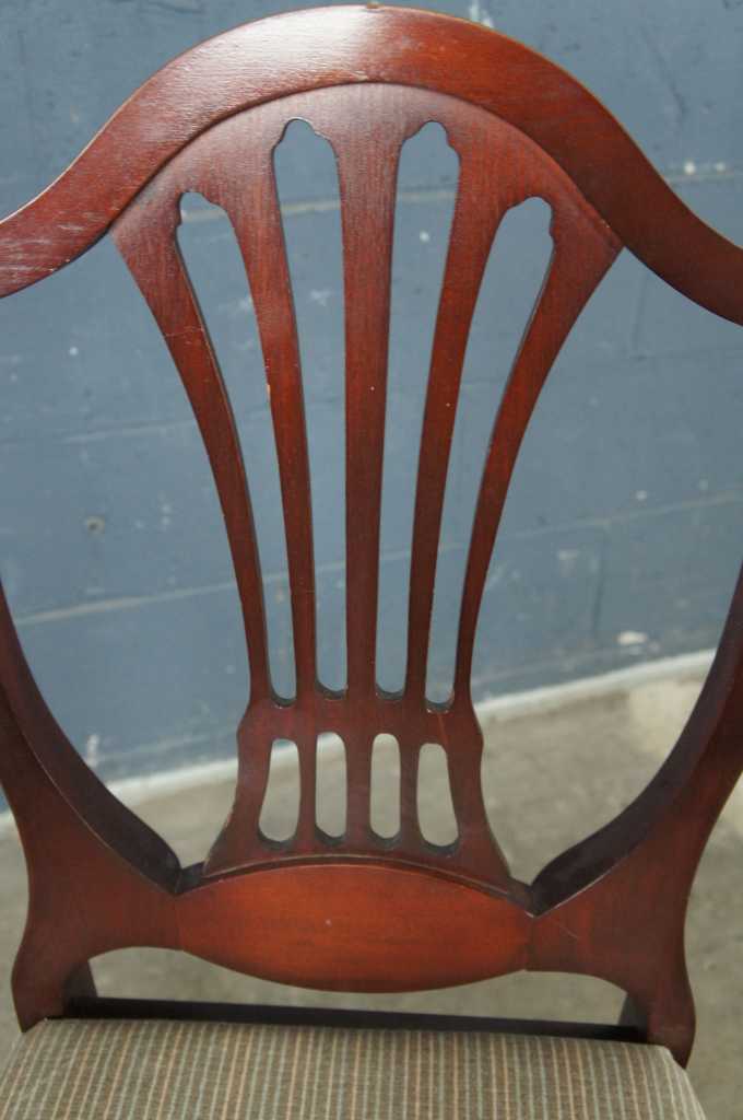 A lovely set of Hepplewhite style dining chairs. Made from Mahogany towards the middle of the century. Featured a pierced shield back and striped upholstery A nice compliment to any dining setting