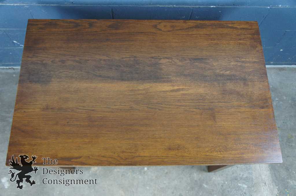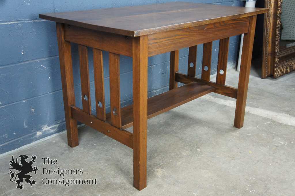A beautiful mission style oak library table. Features 3 pierces slats along the side and a trestle base.