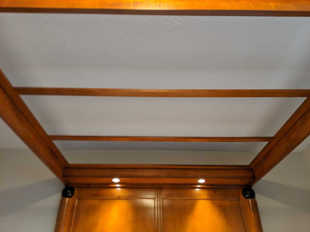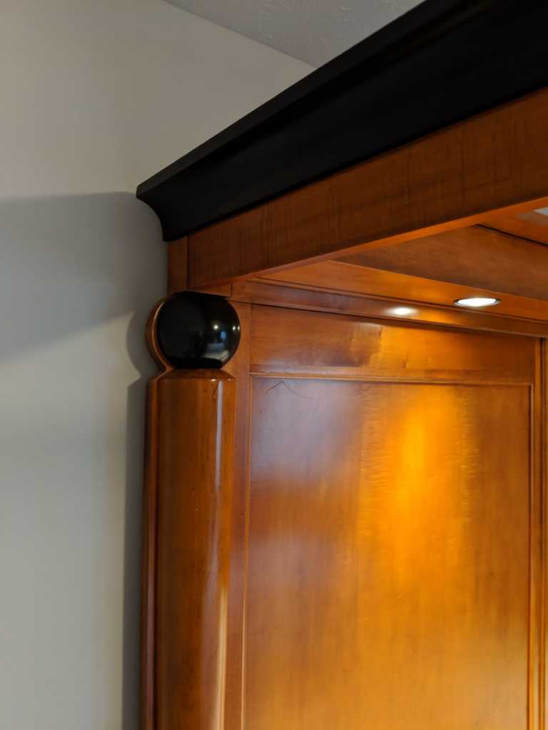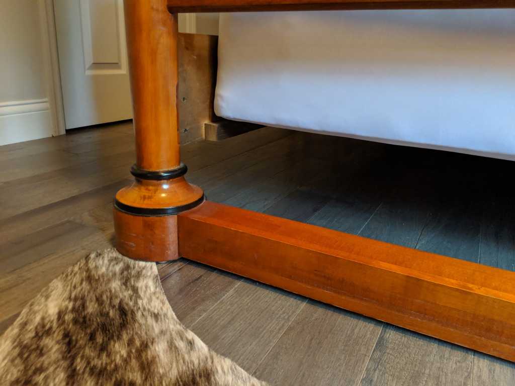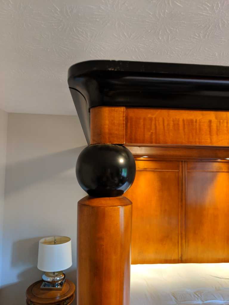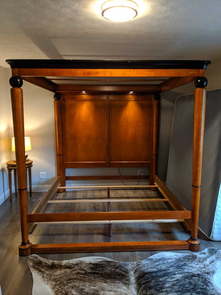 A gorgeous king size canopy bed by National Mt. Airy of North Carolina. Biedermeier style with a glowing maple burl finish. Each post is trimmed in black leading to a canopy that is illuminated by the head of the bed. The light is controlled via a button near the pillow position. The bed includes free shipping. It is completely disassembled allowing it to fit into smaller spaces. Assembly not included.