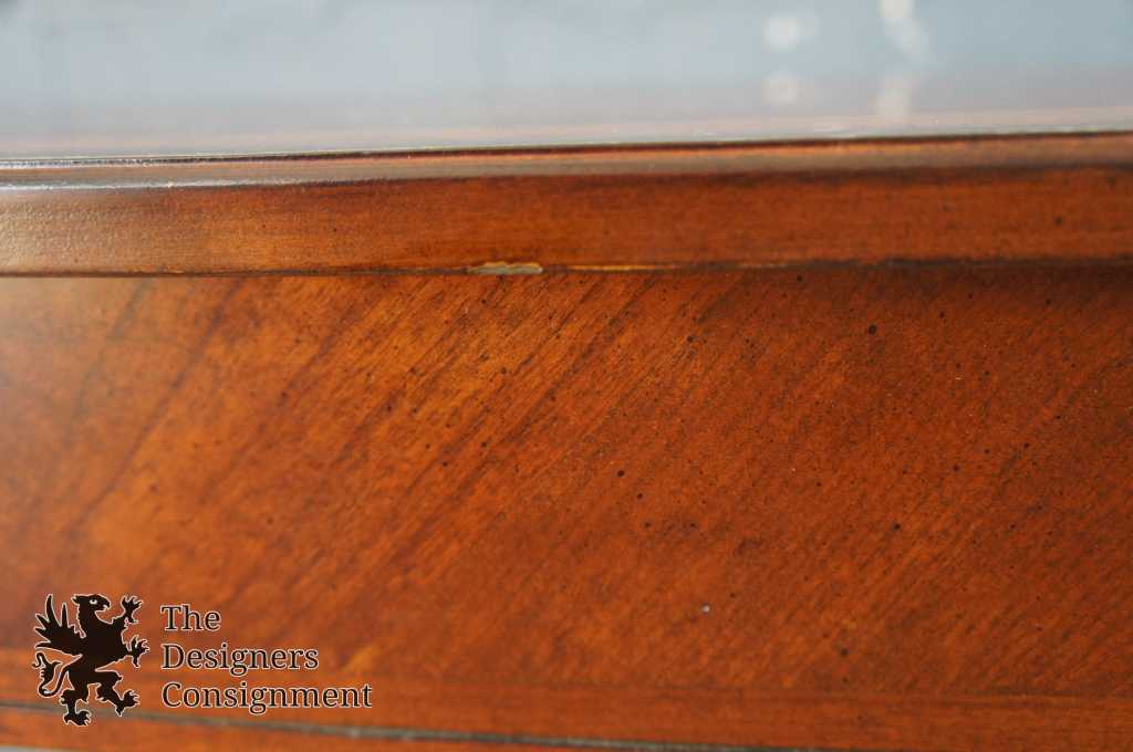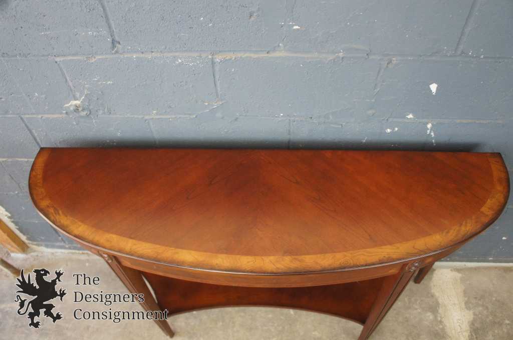 This wide Demilune Console Table features a stunning Olive Ash Burl finish over solid wood and beautifully grained cherry veneers on top with an olive ash burl border. Its magnificent legs taper from tops capped by medallions to almost a point where they reach the floor. The curvaceous lower shelf provides an intriguing counterpoint to the rounded top.