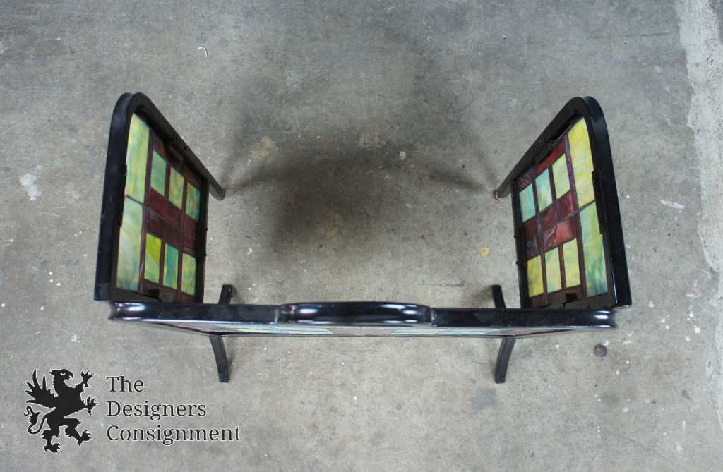 Mission style folding screen. Features a footed metal with beautiful green and red stained glass panels. The outer sections can be removed to work with a smaller area.