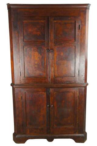 A gorgeous distressed walnut primitive corner cabinet or linen wardrobe. Circa 1850s. Features beautifully paneled doors and a painted white interior with four upper and two lower shelves. A warming addition to any space.