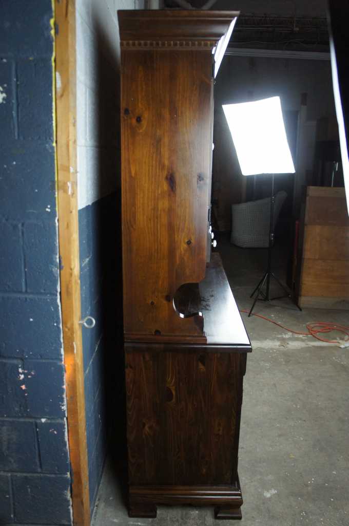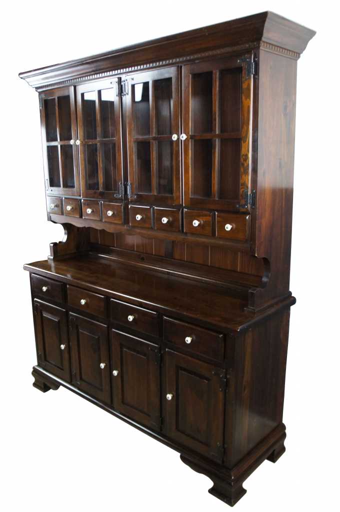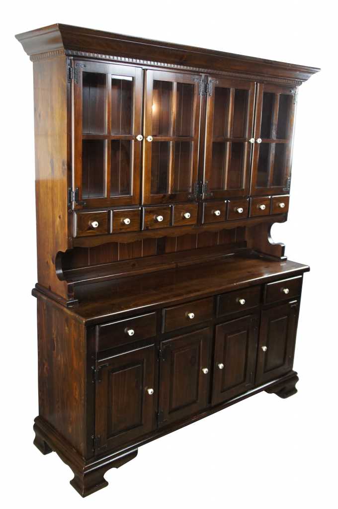A lovely Early American style step-back China Hutch. Perfect for serving and display. Made from pine with a dark finish and porcelain knobs. Includes 8 drawers for storage, plate grooves and upper and lower shelves. Circa 1970s.