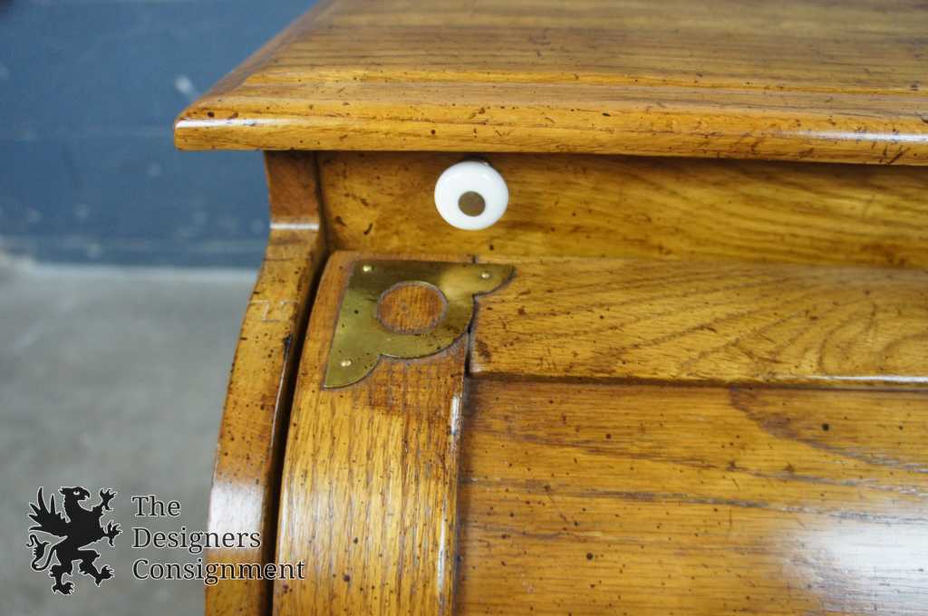 Early American style oak cabinet. Features a half cylinder desk design with a drop front opening and lower cubbys for storage. Includes brass trimmings and porcelain hardware. A great tabletop or accent piece.
