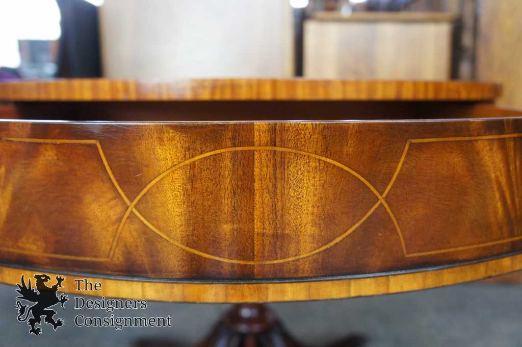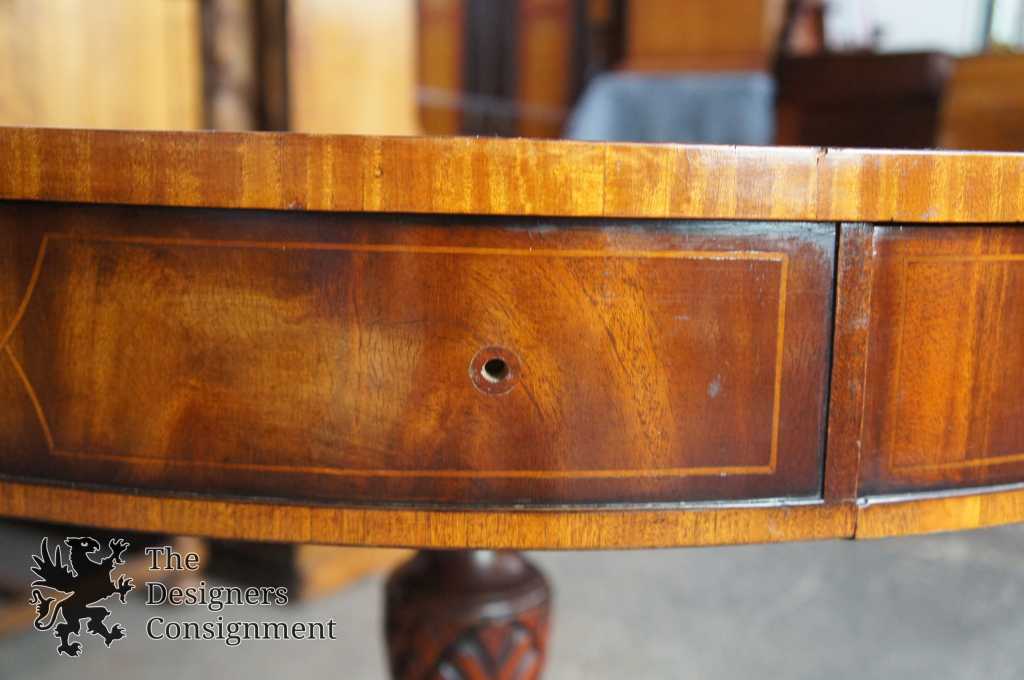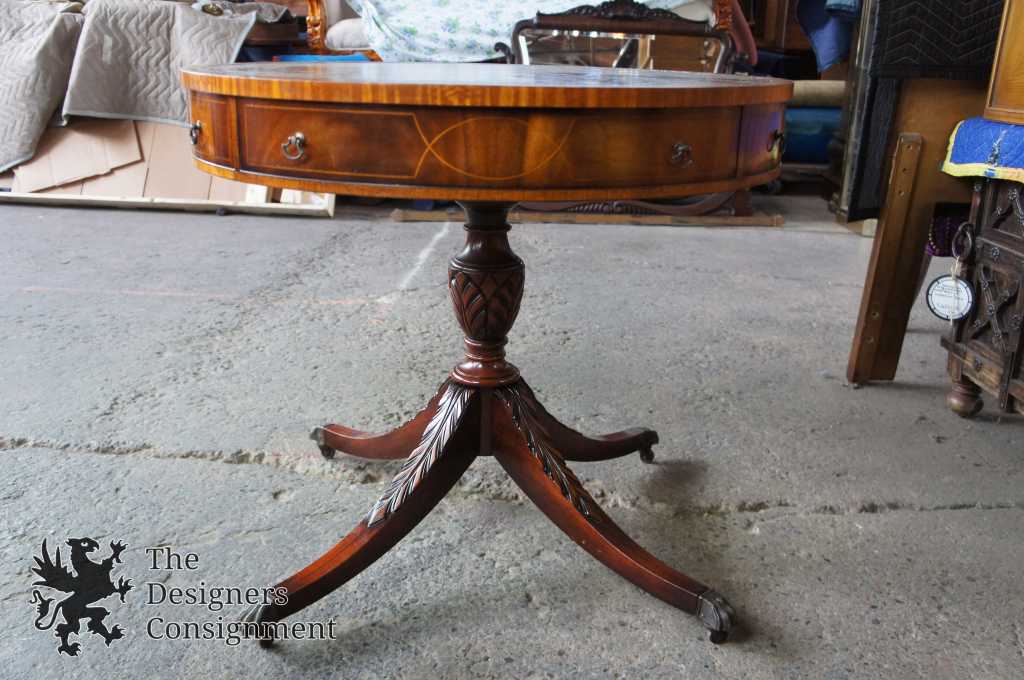 Up for consideration is a beautiful leather top drum table. Circa mid 20th century. Made from mahogany with banded apron and inlaid design. Features a tooled leather top, long dovetailed drawer and carved pedestal base with brass paw feet.