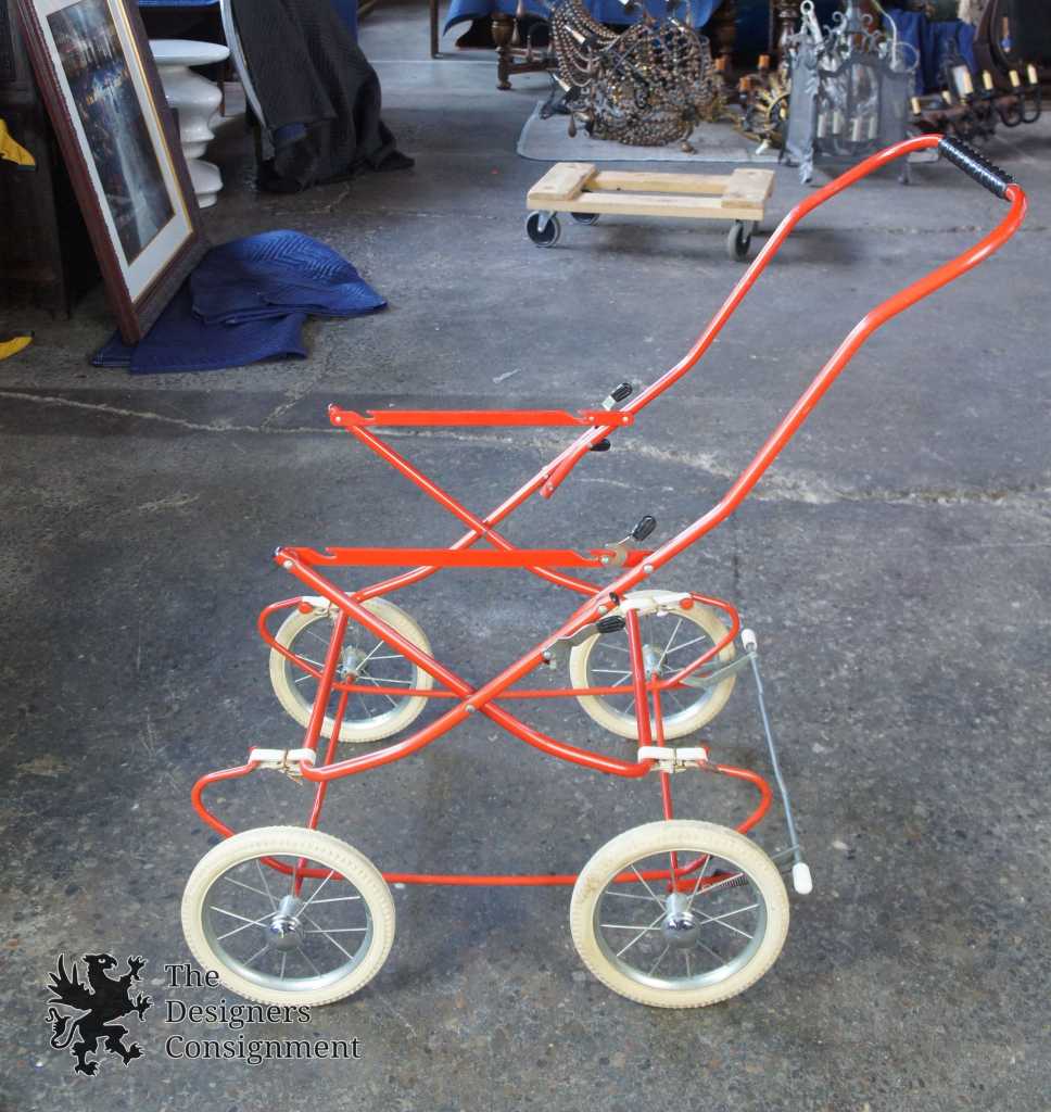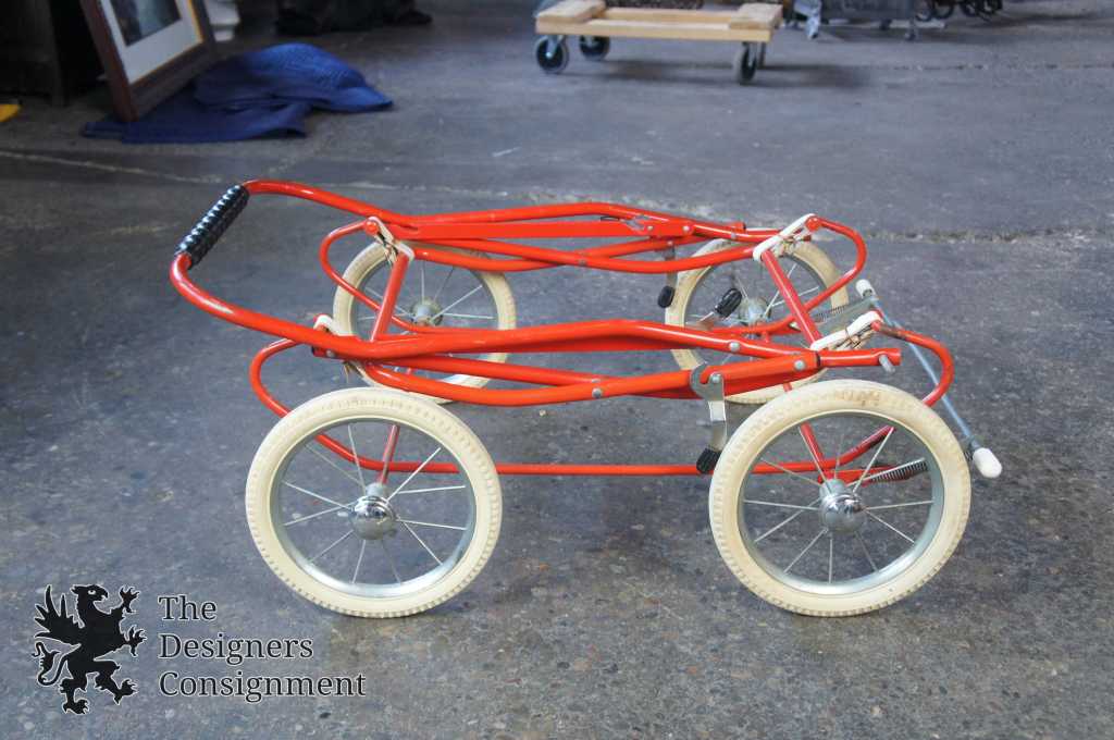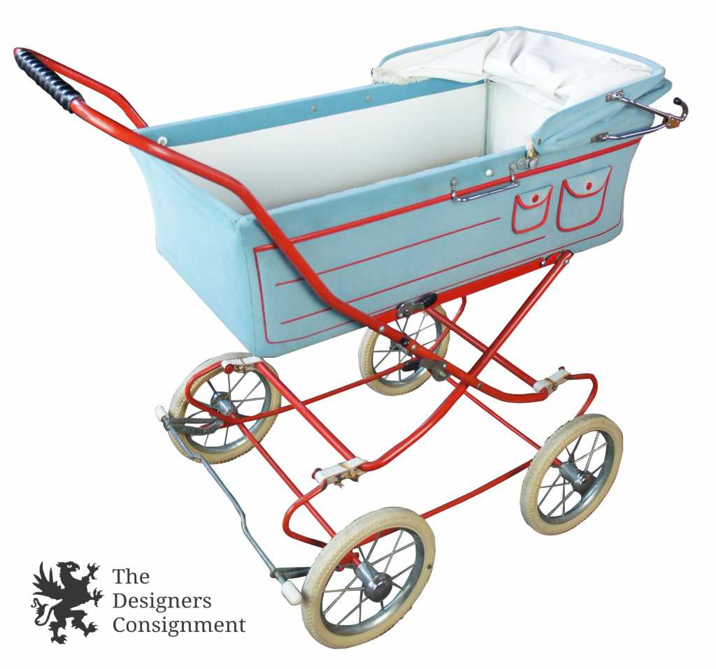 Up for consideration is a beautiful corduroy blue & red baby stroller. A cute design with large rubber wheels, brakes and a leather strap system for shocks. The carriage and base easily fold up allowing it to fit into a car. Includes a Zollner Kindermatrratze.