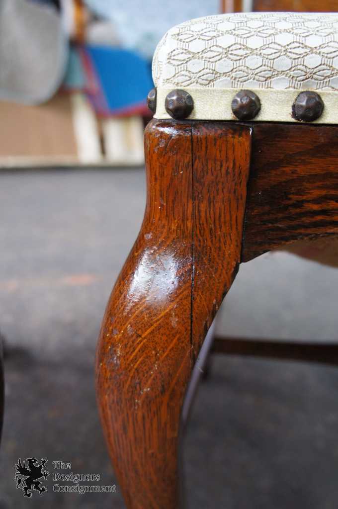 A gorgeous set of six turn of the century solid quarter sawn oak dining chairs. Beautifully designed with curved shoulders, shaped splats and cabriole legs leading to lion paw feet. Covered in a white upholstery with brass nialhead trim. Includes 5 side chairs and one captains chair.