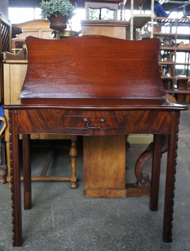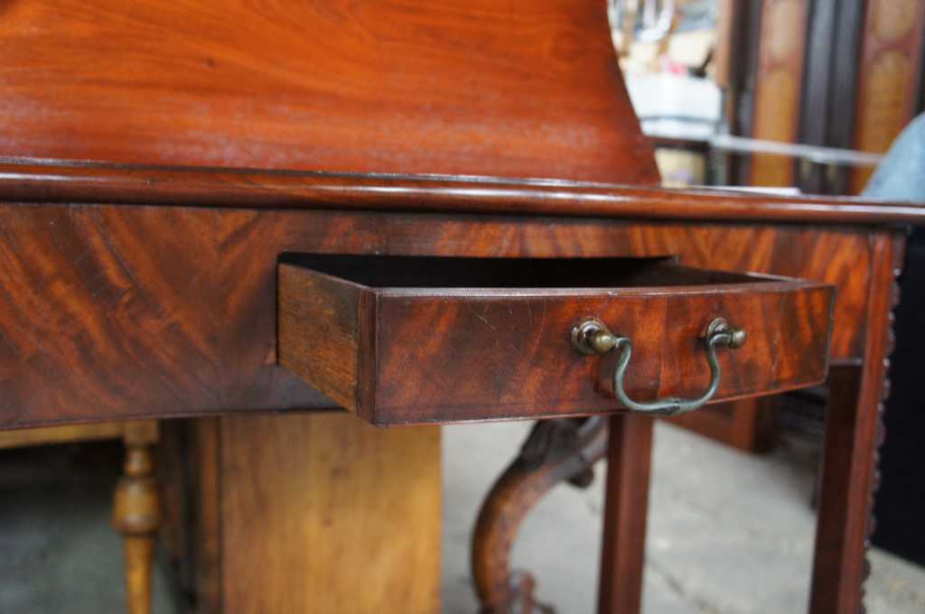 A gorgeous pair of Edwardian era game tables. Perfect for an entryway or hall area. Serpentine with mahogany finish and carved legs. The tables flip open and are supported by a gate-leg that swings out from the rear.