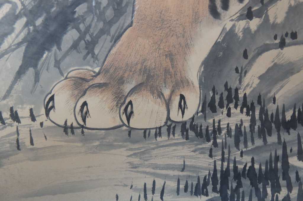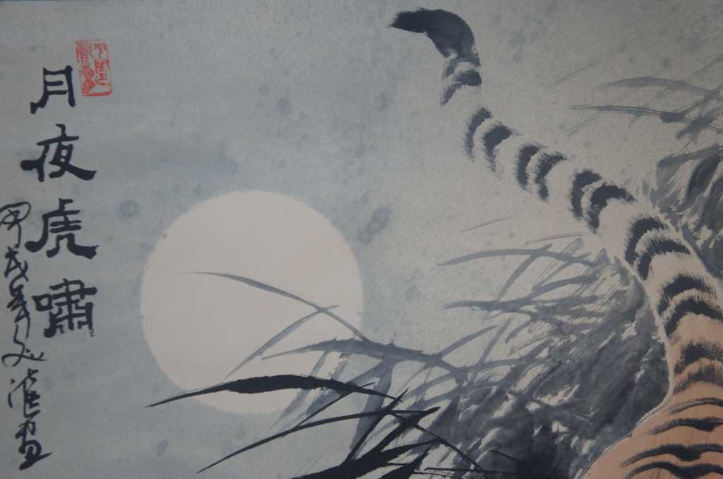 Vintage Mid Century Japanese Tiger Scroll Wall Hanging Signed Silk Artwork