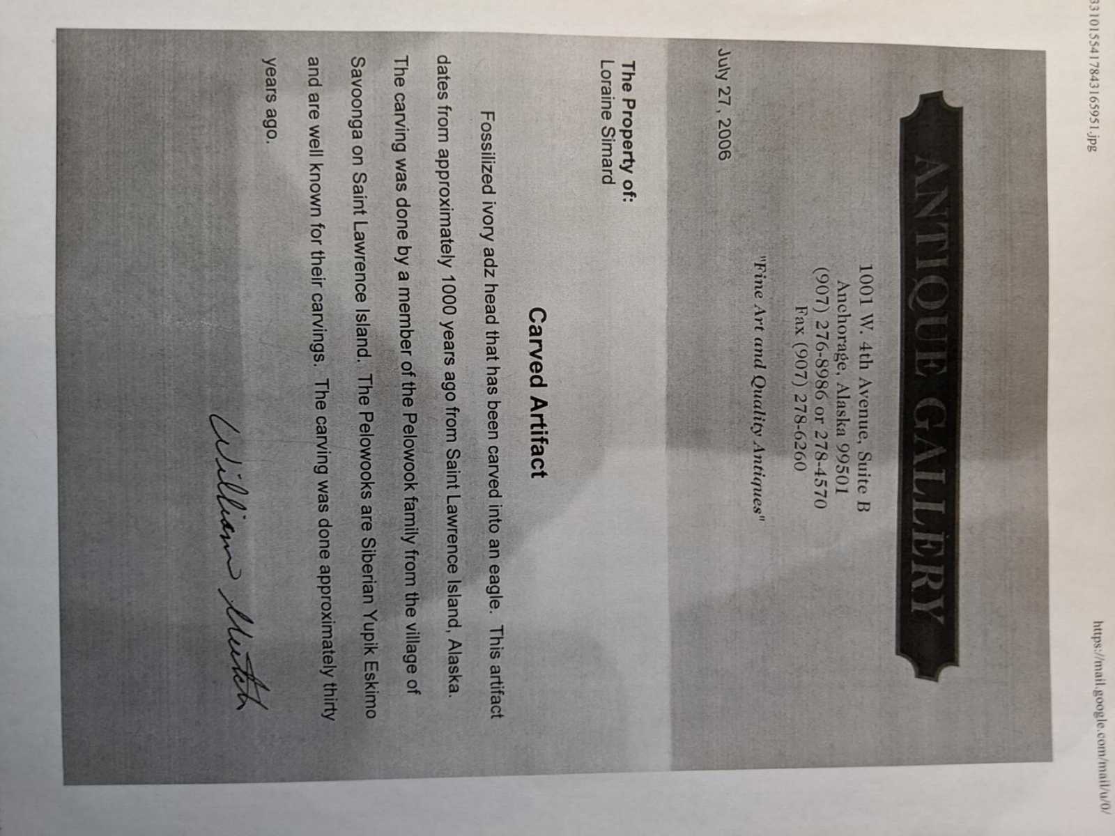 Fossilized adz head that has been carved into an eagle. This artifact dates from approximately 1000 years ago from Saint Lawrence Island Alaska. The carving was done by a member of the Pelowook family from the village of Savoonga on Saint Lawrence Island. The Pelowooks are Siberian Yupik Eskimo and are well known for their carvings. The carving was done approximately thirty years ago. Copy of original purchase description included