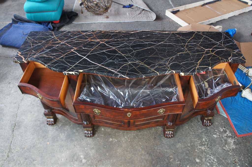 This stunning Natchez buffet features a gorgeous crotch mahogany front highlighted by beautifully designed pillars, paw feet and a richly detailed St. Laurent marble top. With its serpentine front, intricately carved and highlighted accents, and combination of wood and glass doors, this piece provides ample storage in an elegant design. Both glass cabinets have lights which can highlight your accessories. The large center drawer and the right wing drawer are lined with Henredon Pacific Silver Cloth to maintain and protect your silverware and silver and gold accessories.