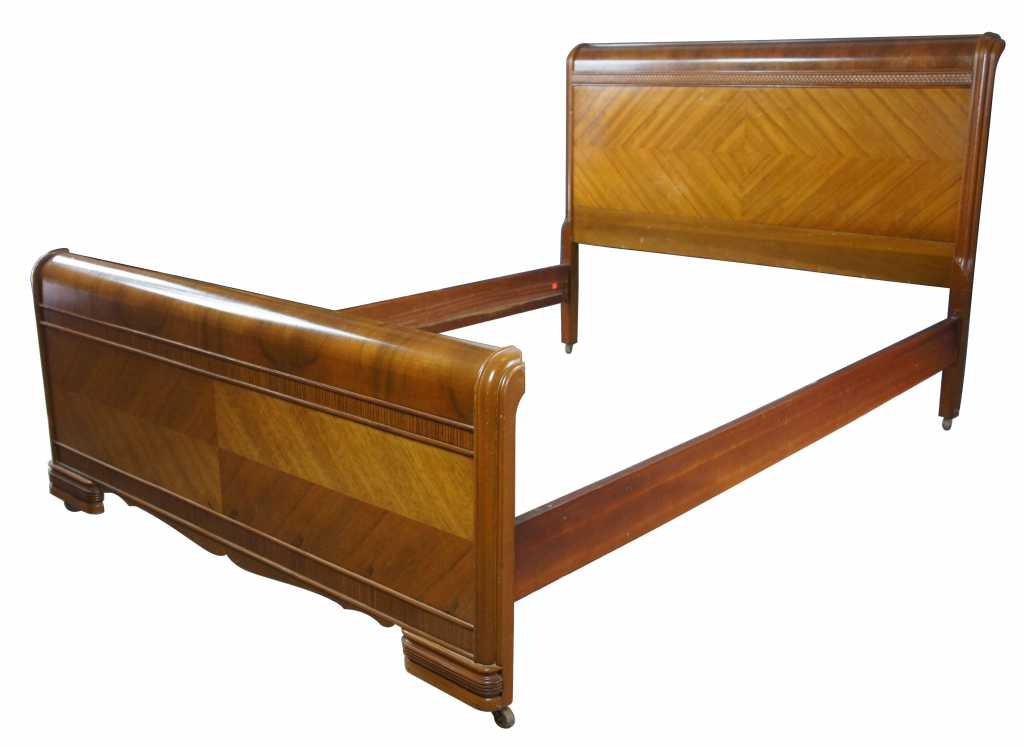 A lovely art deco waterfall bed frame. Made from walnut with a gorgeous diamond box pattern veneer. Circa 1940s.