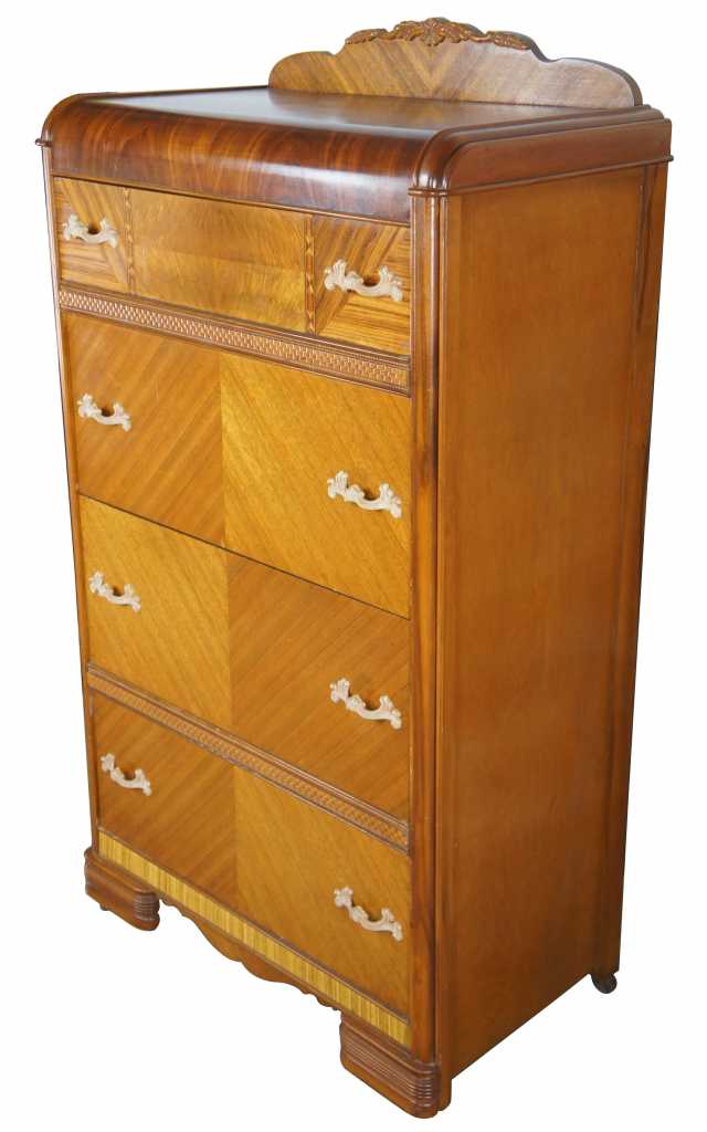A stunning early 20th century art deco tallboy dresser. Made from walnut with a water fall front and diamond box pattern. Includes Bakelite hardware. A nice compliment to any bedroom setting.