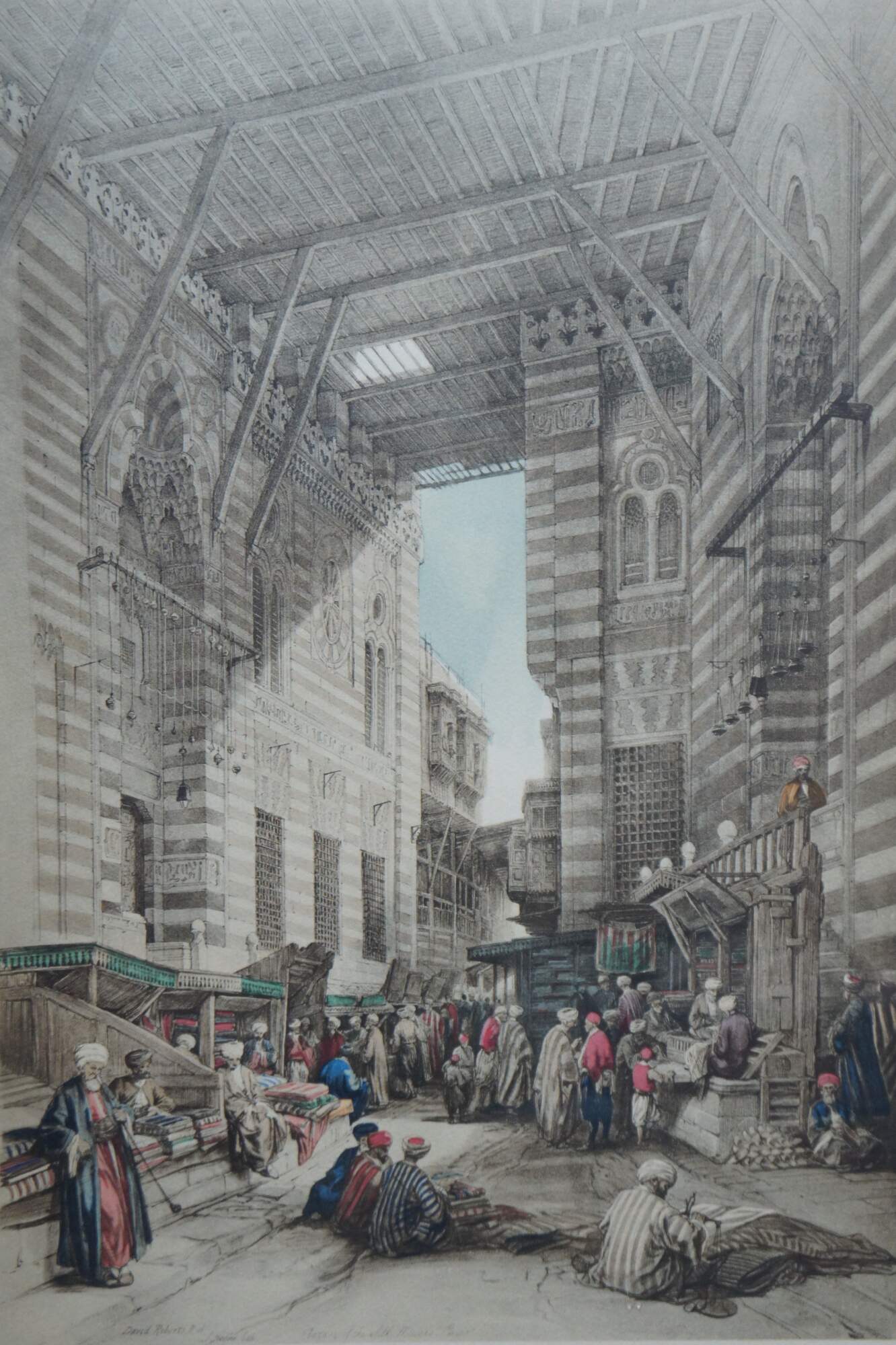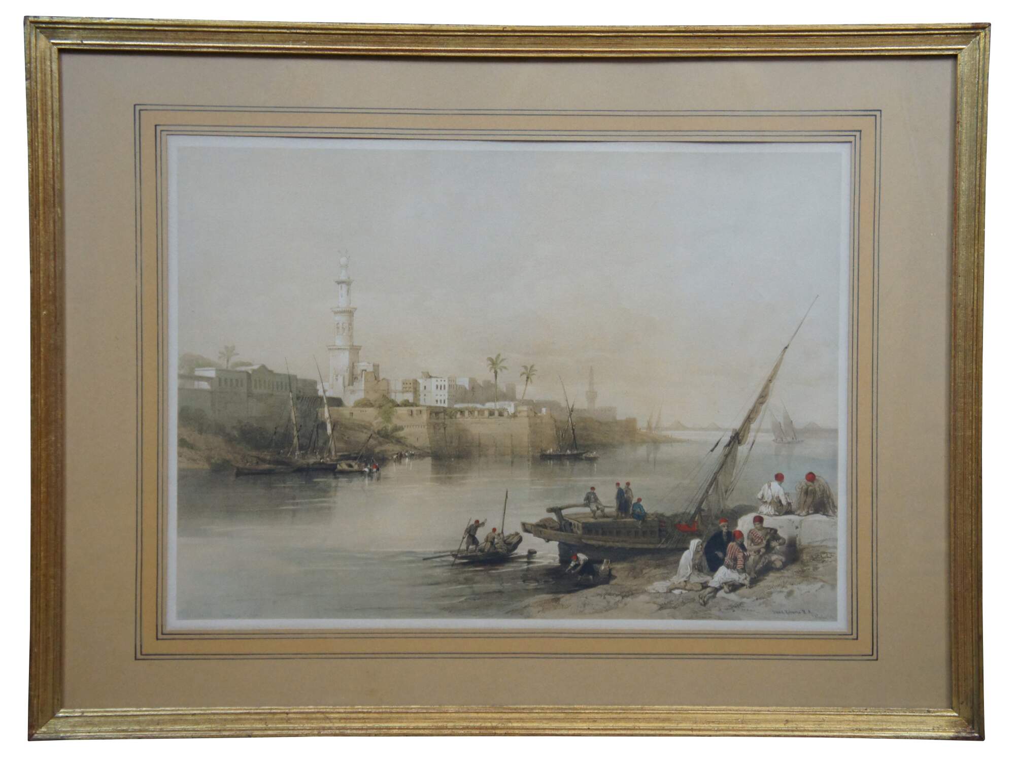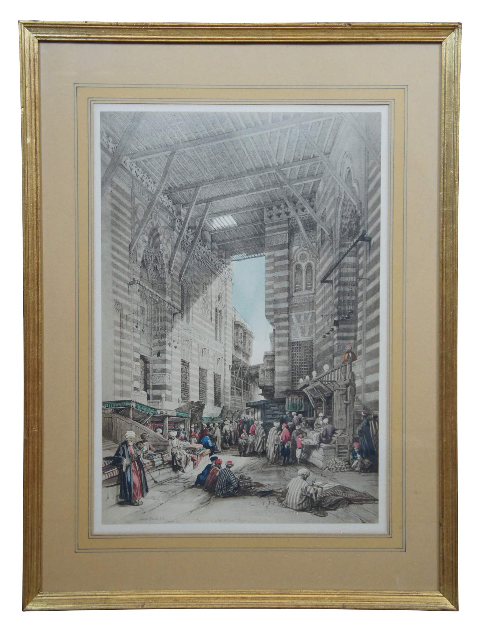 Pair of vintage hand colored lithograph prints by 19th century artist David Roberts, featuring Egyptian scenes, titled “Bazaar of the Silk Mercers, Cairo” and “View on the Nile Ferry to Gizeh"".