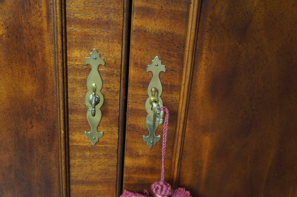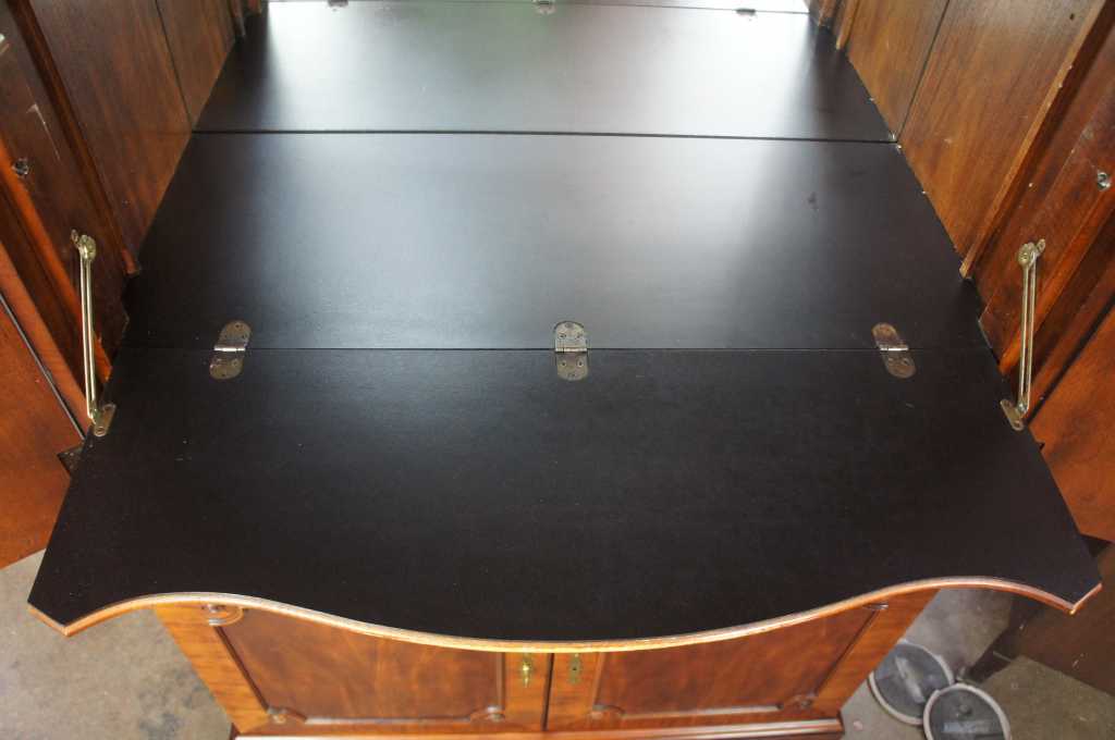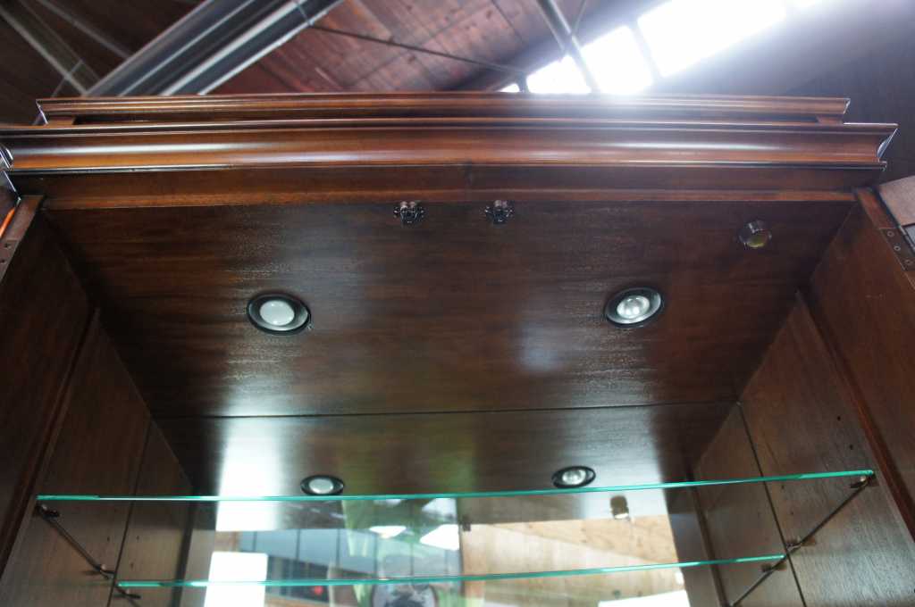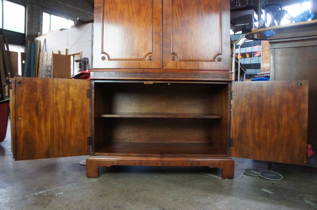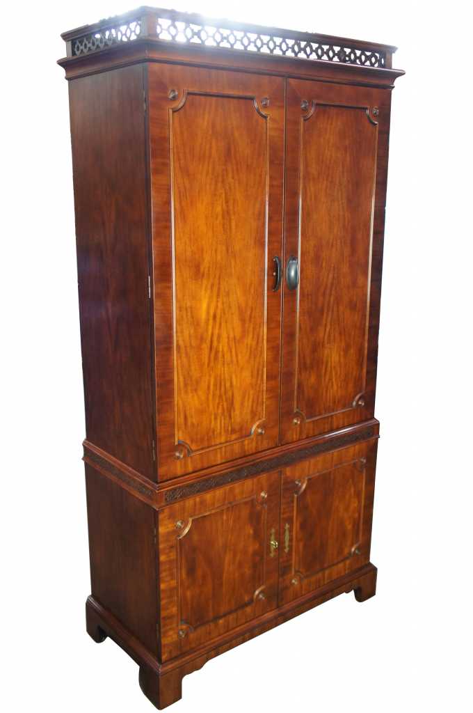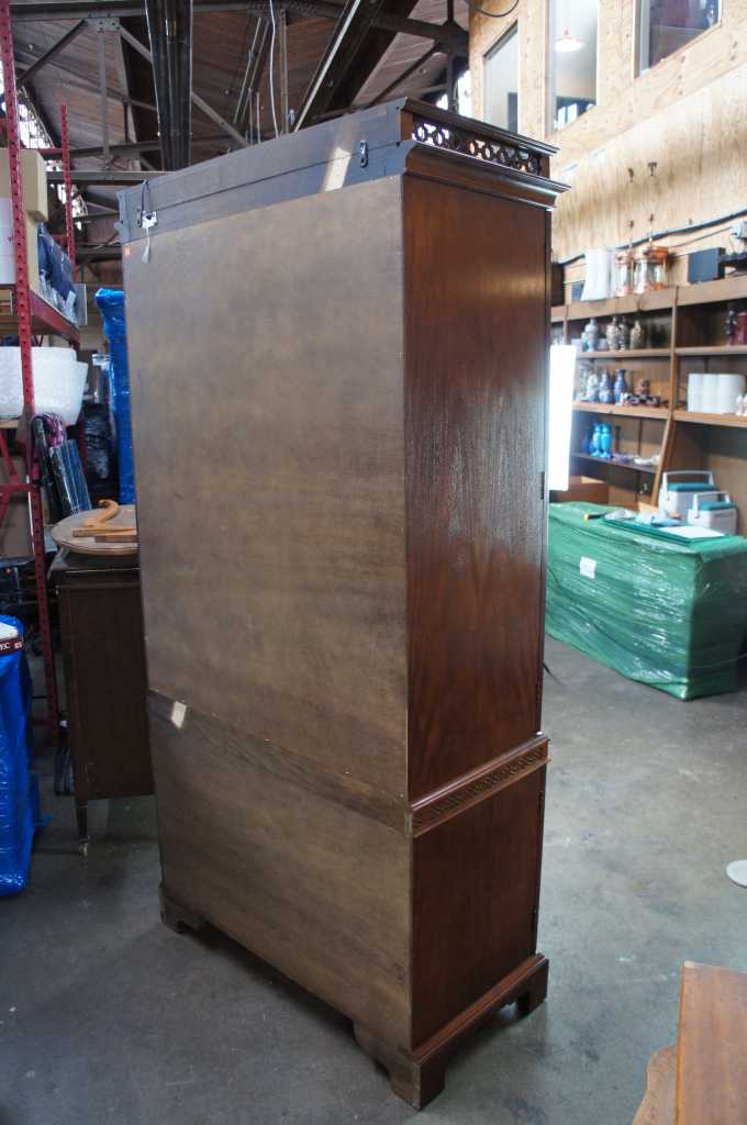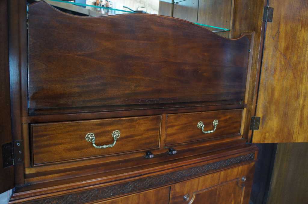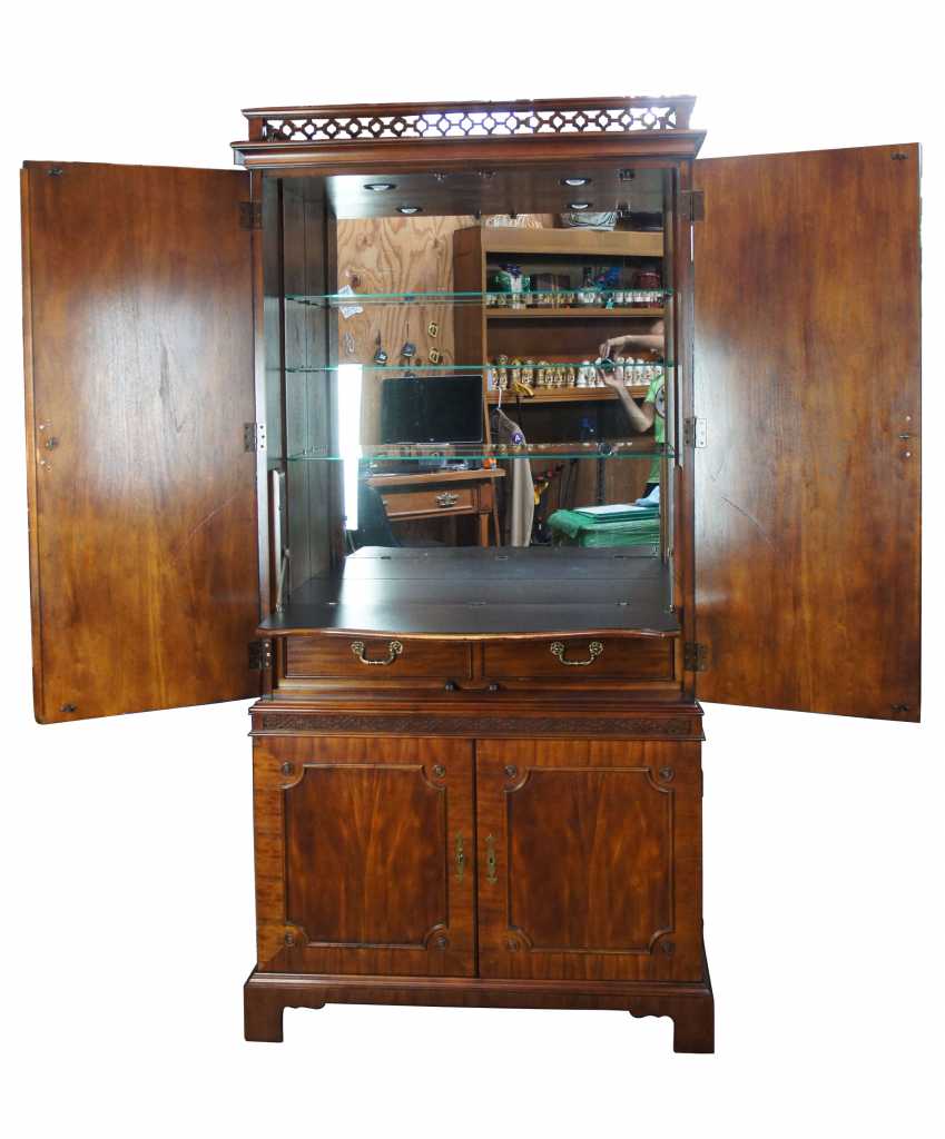 A gorgeous illuminated bar cabinet by Century Furniture of Hickory North Carolina. Circa 1980s. Made from mahogany with carved fretwork and bracket feet. The cabinet opens to a mirrored backing with three shelves and flip down surface for serving. Includes two drawers, lower cabinet with shelf and brass hardware. The perfect compliment to your dining, living room or office.