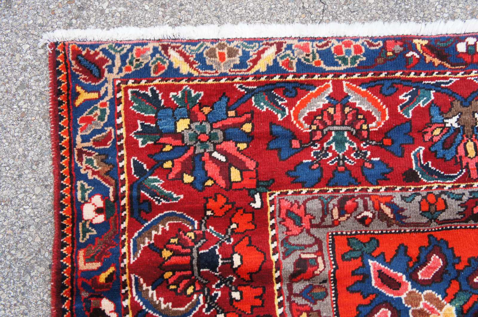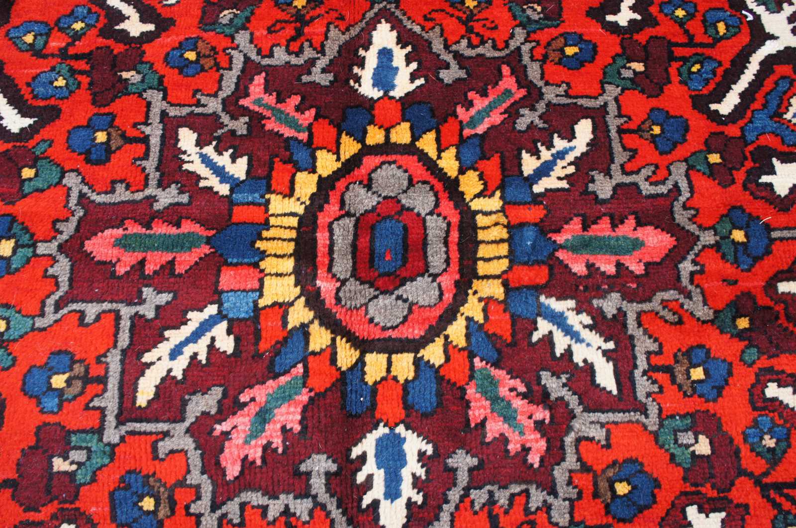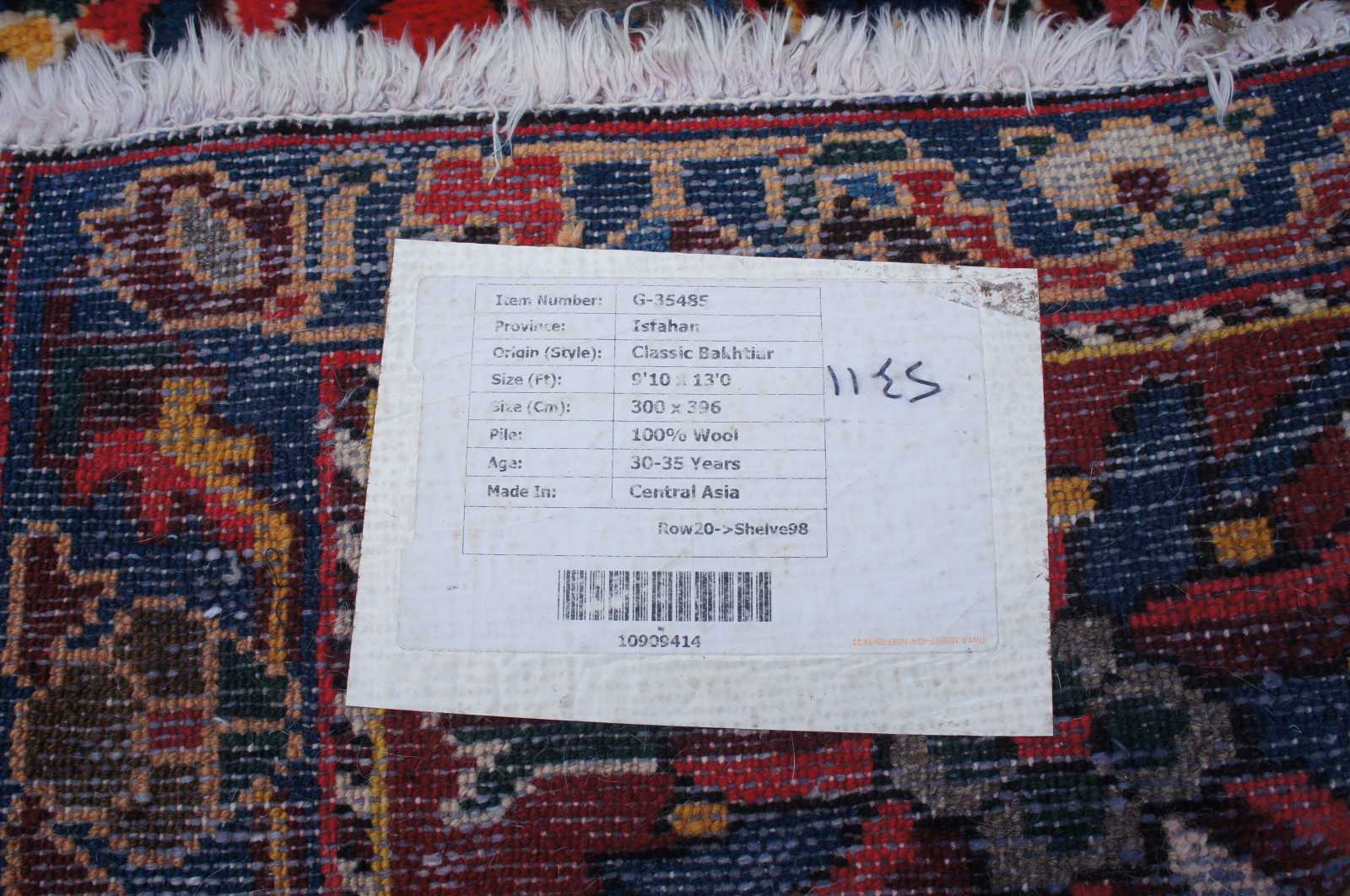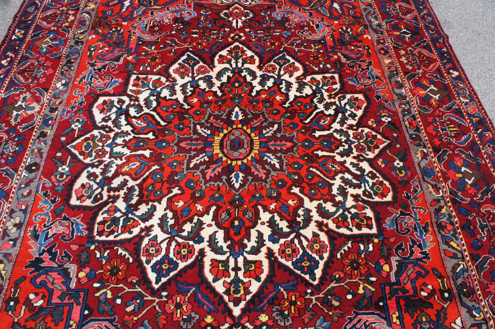 Vintage Bakhtiar Isfahan Oriental rug. Features a floral all over design with central starburst or sunburst medallion over a field of reds with white / cream / tan, blues, greens, pinks, yellow, grey, brown, orange and black accents. Made in Central Asia in Isfahan, a city in central Iran, known for its Persian rugs and architecture. Constructed of 100% wool, hand knotted Persian knots. Circa 1960s-1970s.