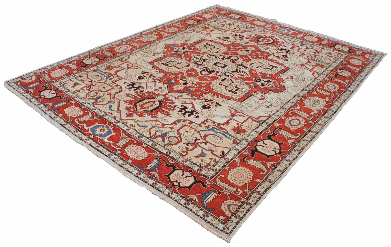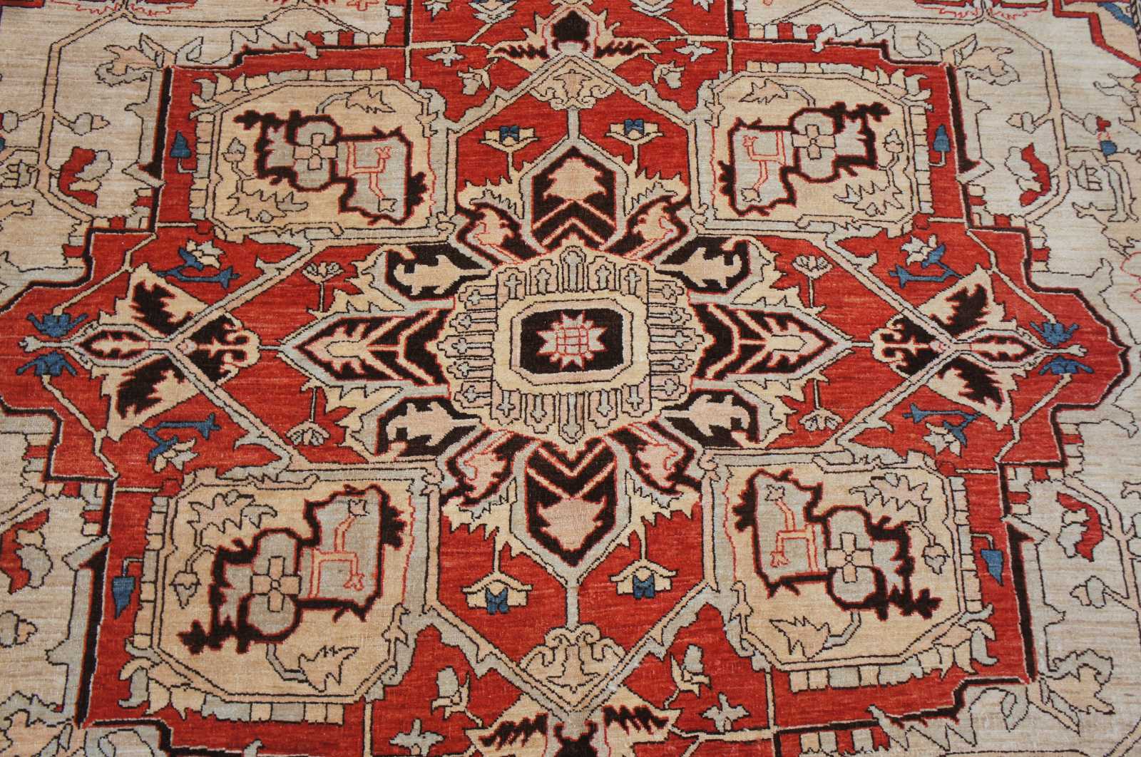 Vintage Persia Revisited Heriz area rug carpet. Features a field of tan / ivory / beige with a central medallion and floral motif with reds, blues and black accents. Constructed of 100% hand spun wool and 100% hand made natural dyes. Made in northern Persia in the city of Heriz by a woman named Heydarian using traditional weaving techniques.