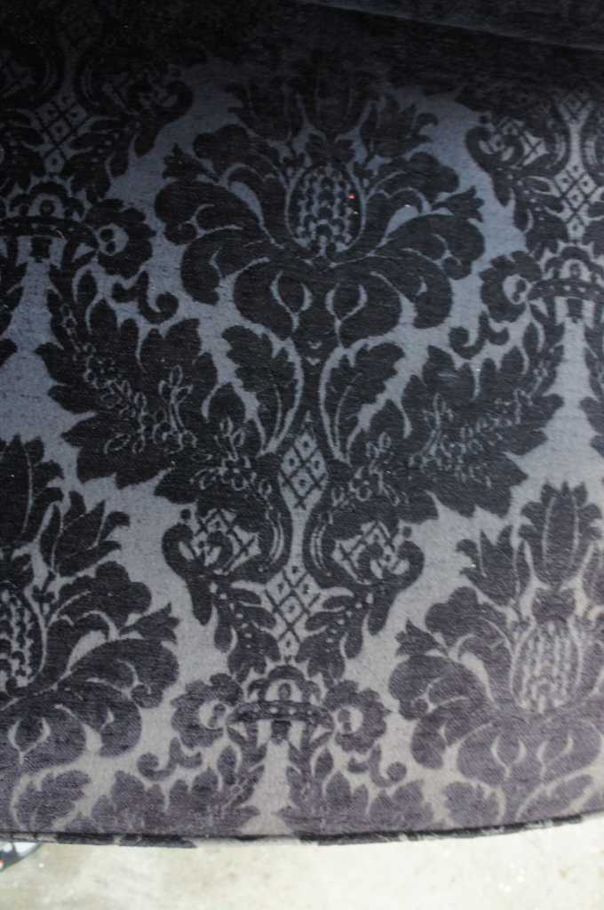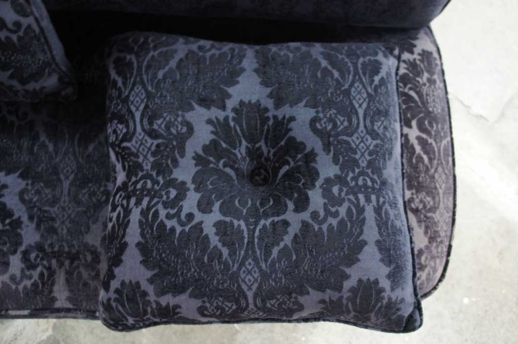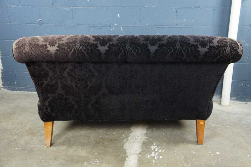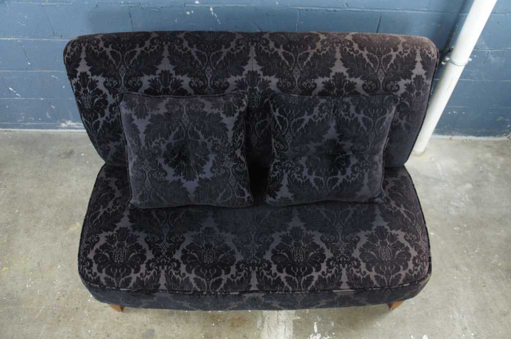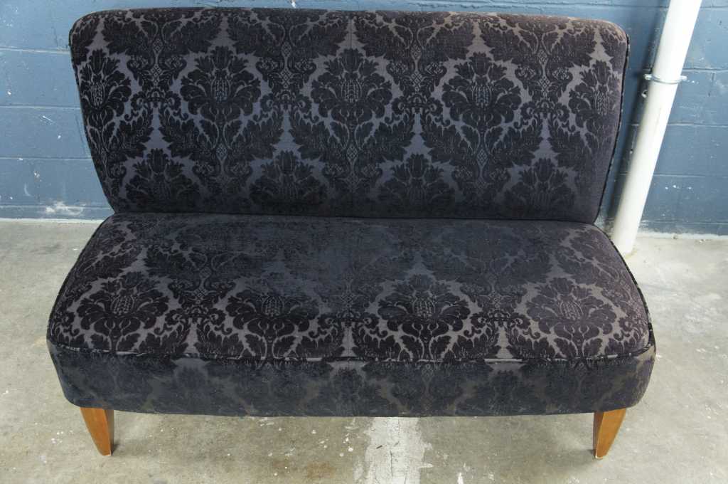 Beautifully upholstered in a flocked floral fabric. This settee was the signature model before the current Elkins Tufted Settee 44-1005