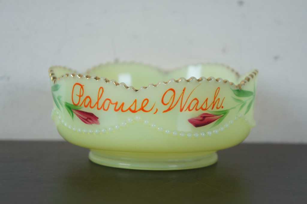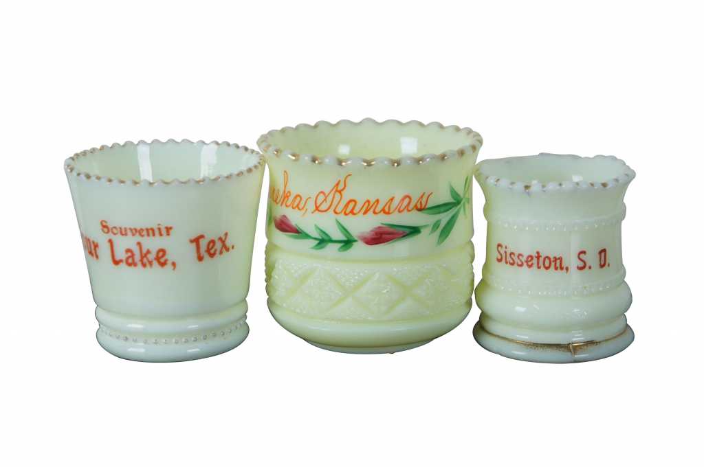 Heisey Uranium Glass Lot; features the following: Sisseton South Dakota; Palouse Washington; Otisville Michigan; Mount Lake Park Maryland; Sour Lake Texas; Maynard Minnesota; Eureka Kansas