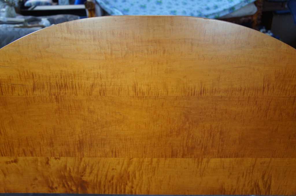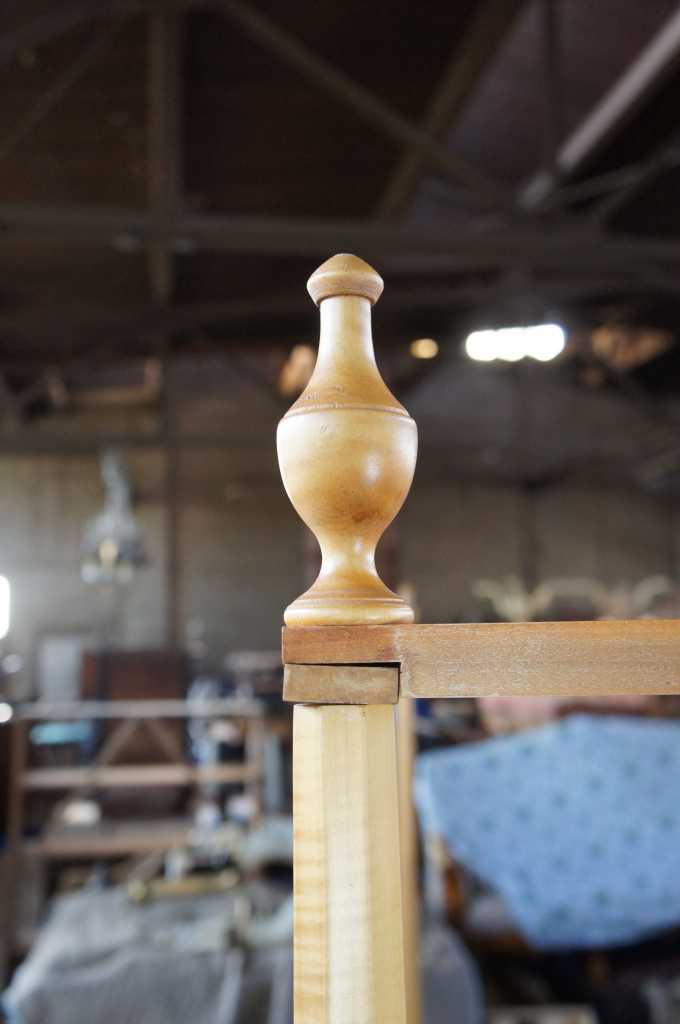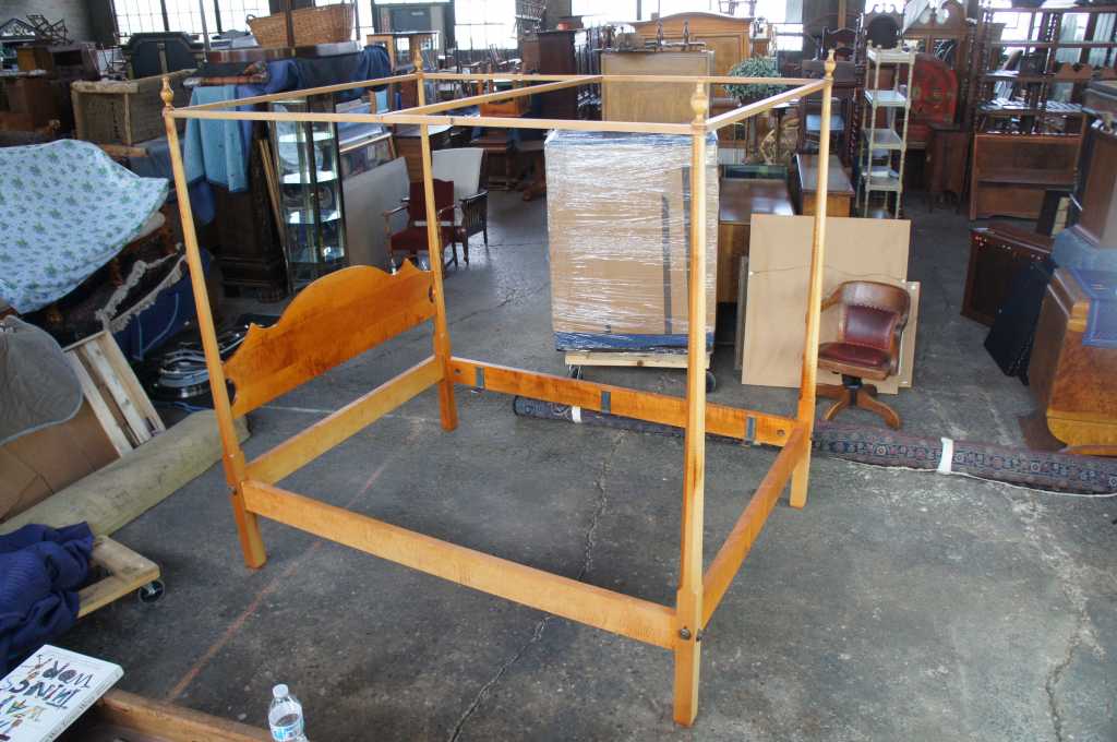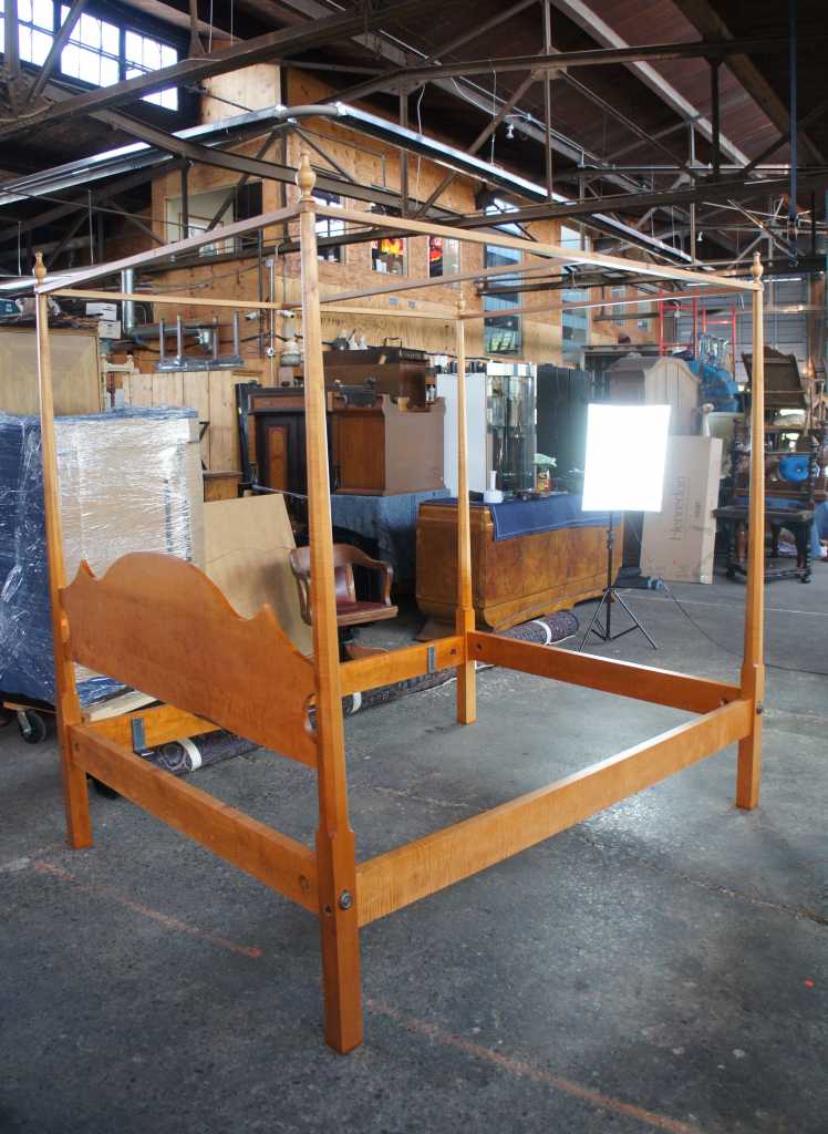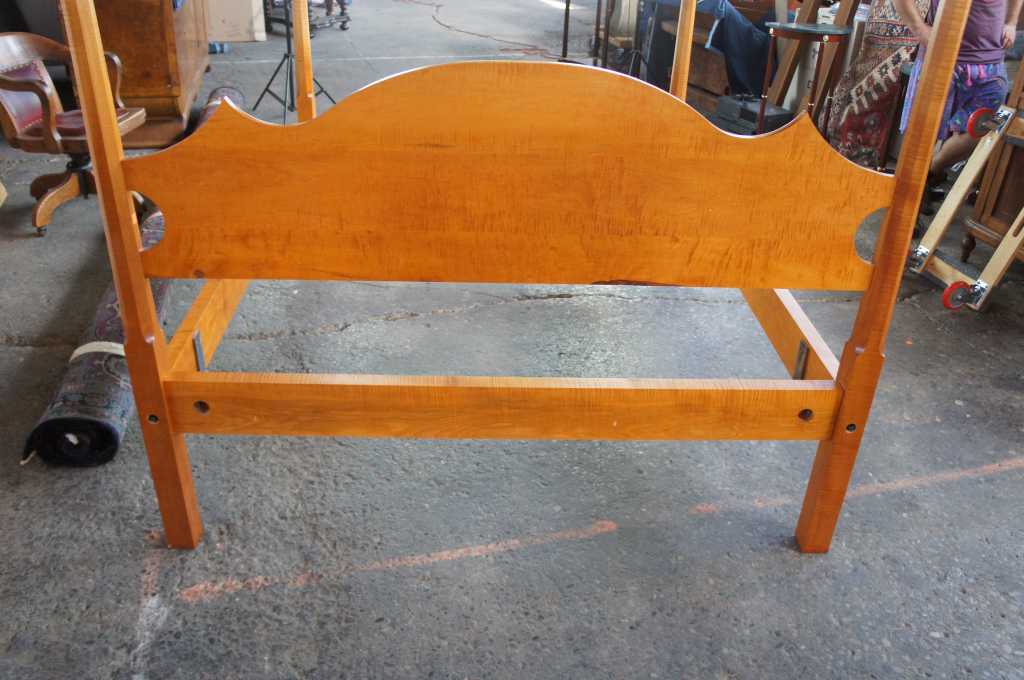 A gorgeous shaker style pencil poster bed. Includes canopy and finials. Made from solid curly maple with a stunning wood grain.