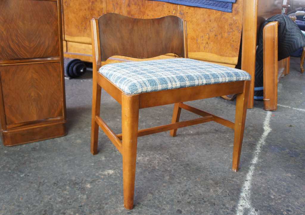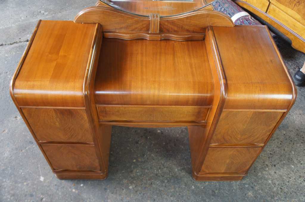 Palace Furniture Co. Dressing Table. Made from walnut with a gorgeous waterfall front leading to matchbook veneered drawers. Includes Matching vanity bench. Palace Furniture operated out of Clarksburg, Viriginia. Specializing in high end caseloads. A gorgeous piece that will add warmth to any room.