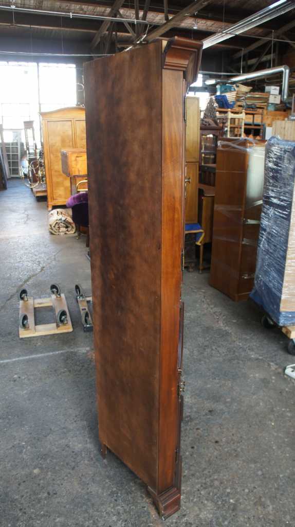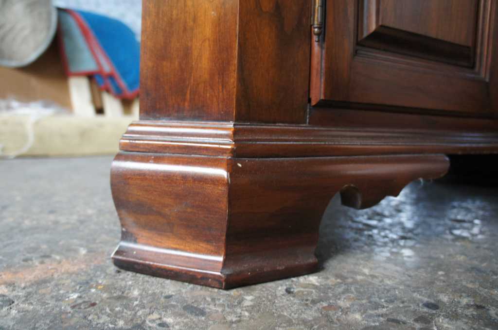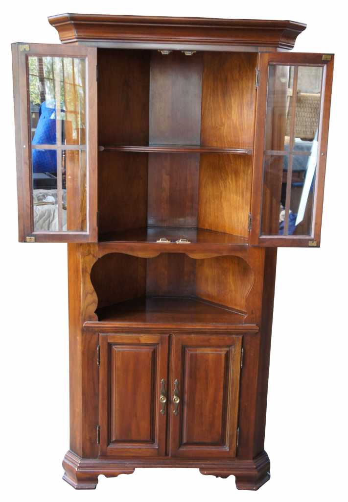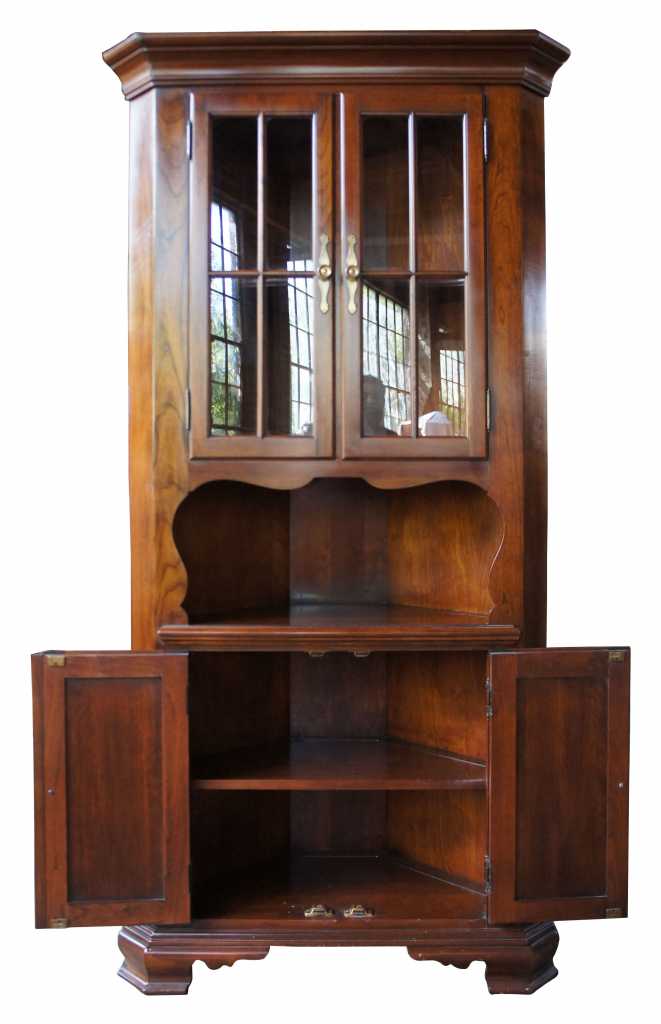 A lovely walnut corner cabinet. Features a central surface with plate grooves along the back. This allows for serving or display. Glass doors open along the top to two additional surfaces with more plate grooves. Bottom doors open to reveal additional shelving.