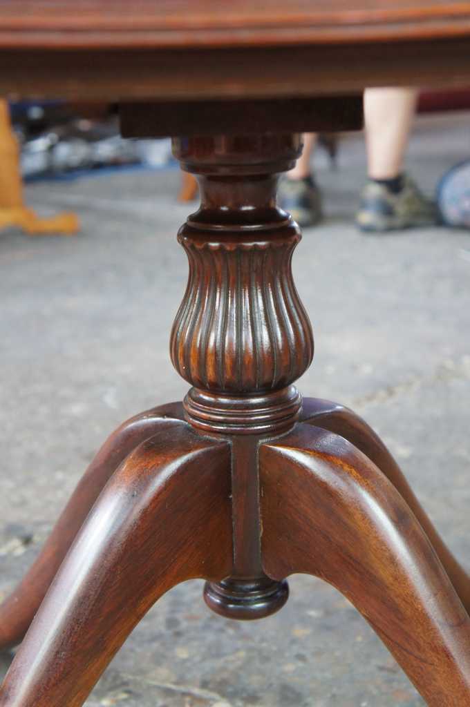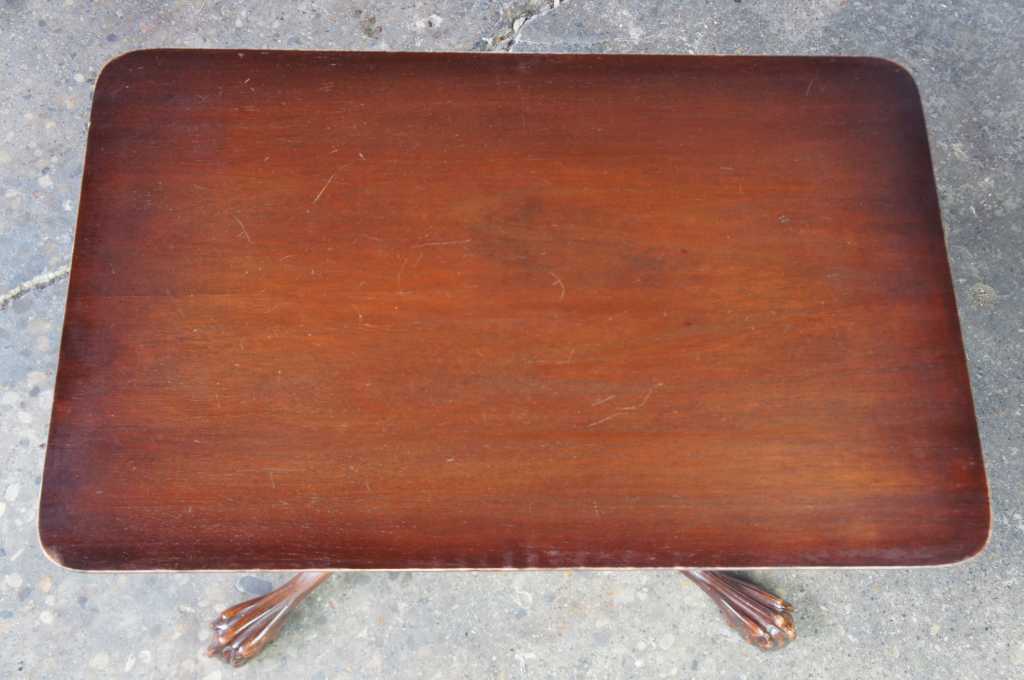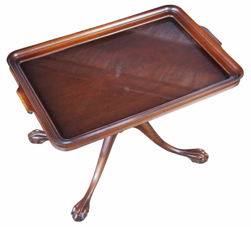 A stunning 20th century mahogany tray table. Perfect for use as in front of a sofa, or as a side table next to chairs. Includes a handled glass top for serving and a pedestal base with ball and claw feet. Believed to be manufactured by Imperial Furniture of Grand Rapids, Mi.