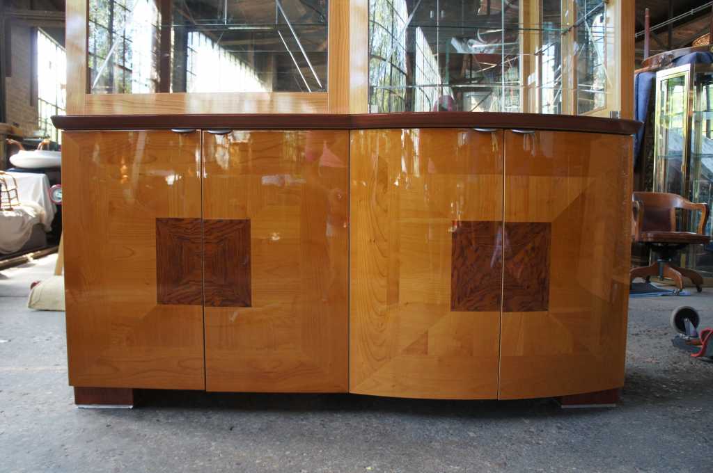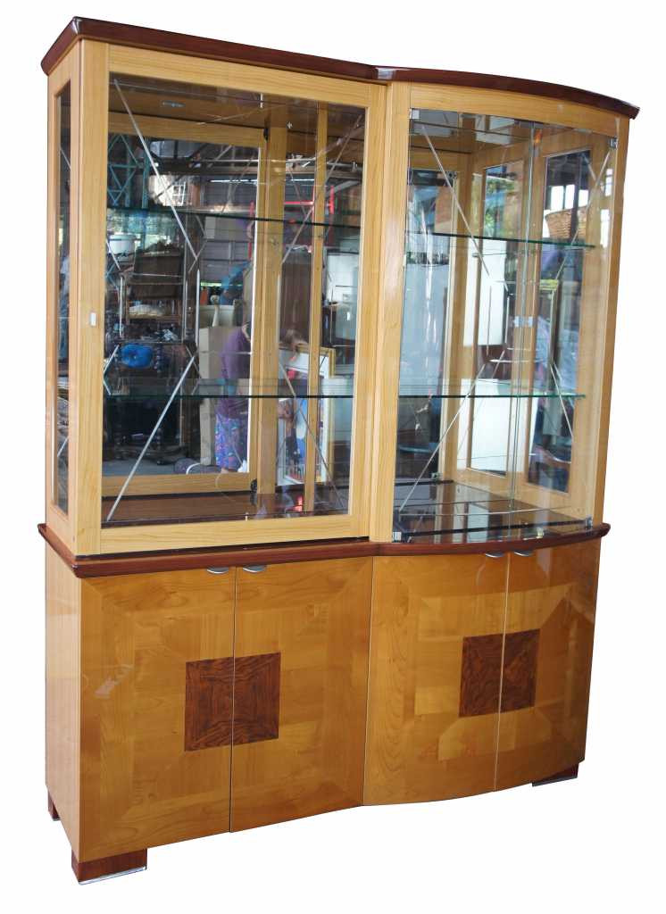 A gorgeous cabinet that can be used for display in any setting. Made from maple and walnut with a lacquered high-gloss finish. An illuminated top with mirrored backing over a cased bottom. Features a sliding door along the left and traditional doors to the right with etched glass.