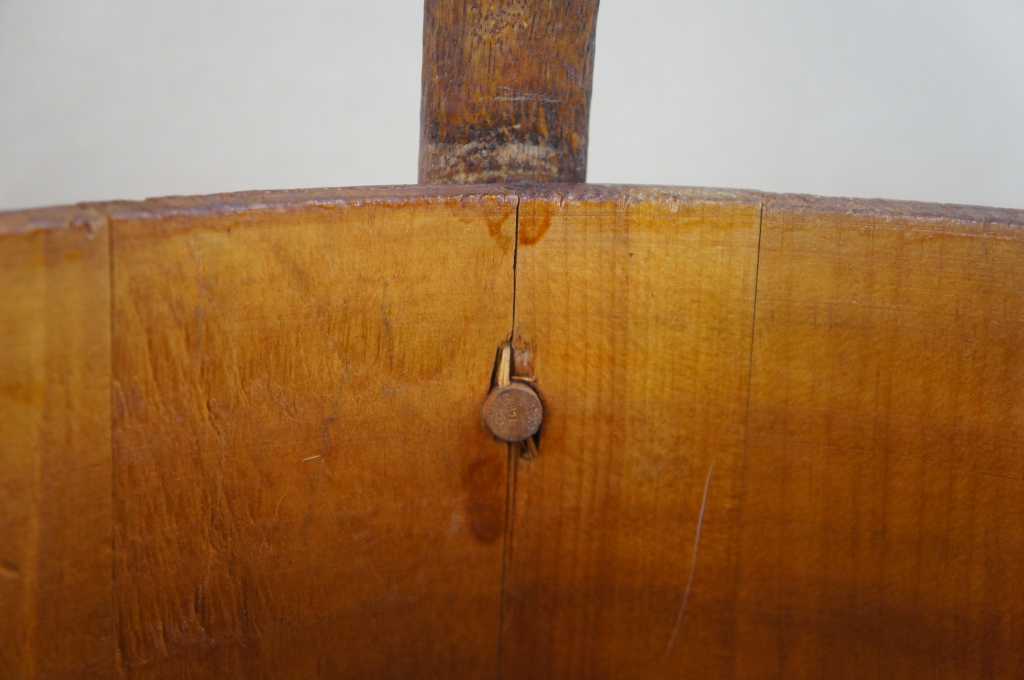 Large 19th century 12" pine firkin with swing handle. Firkins are casks that were formerly used for liquids, butter or fish. Marked 7-2-32 Fall