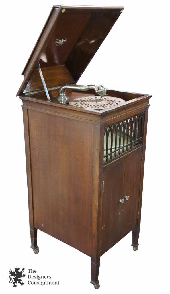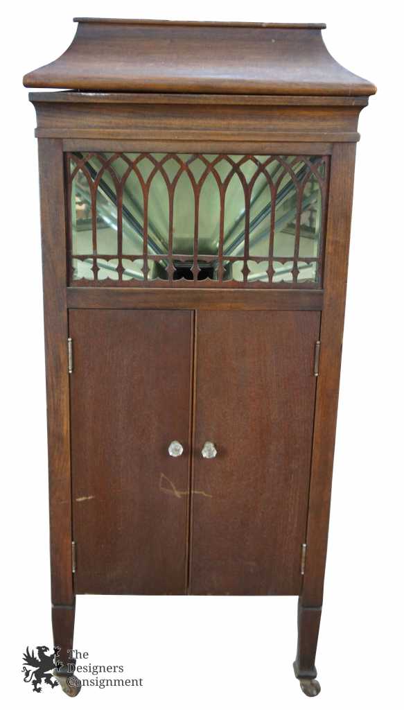 Crystola Phonograph. Features a Mahogany case and mirrored glass tone chamber.