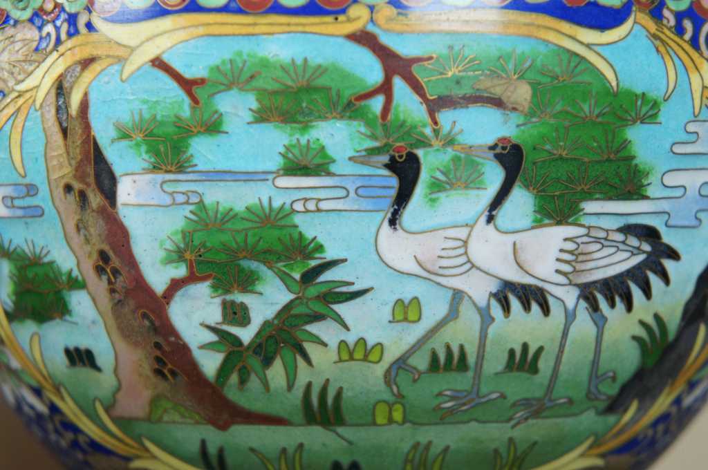 2 Cloisonne vases; featuring cranes picking from a cherry blossom tree. A true pair that mirror eachother.