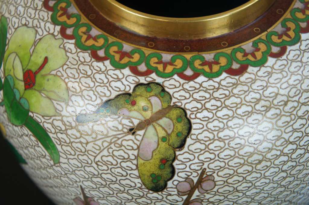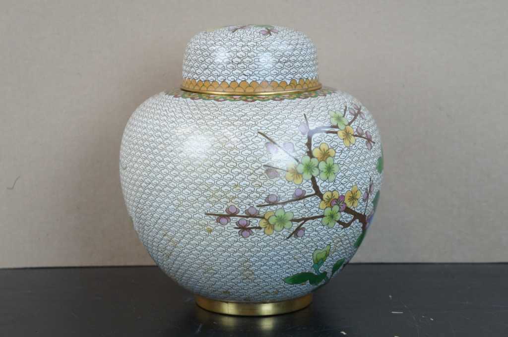20th Century white/ivory enamel lidded ginger jar; features cherry blossoms, peonies, a butterfly on a sea of clouds.