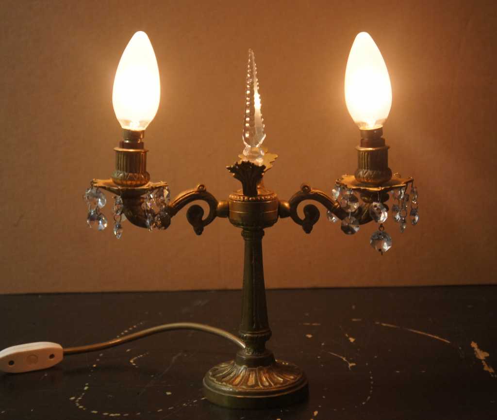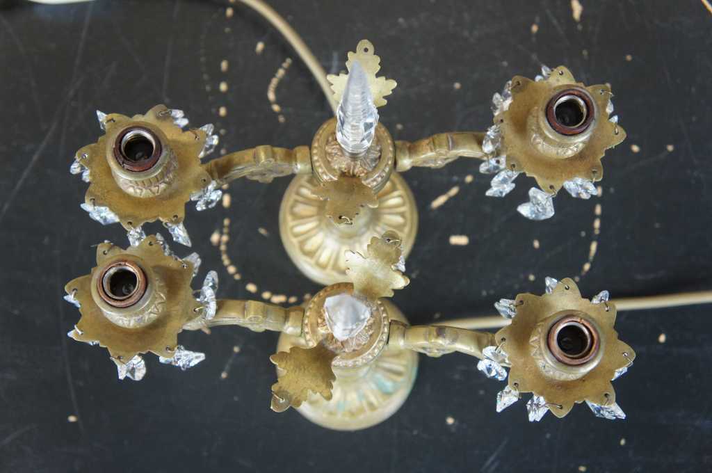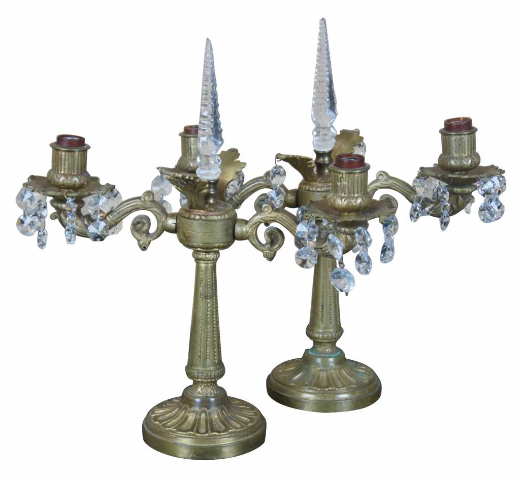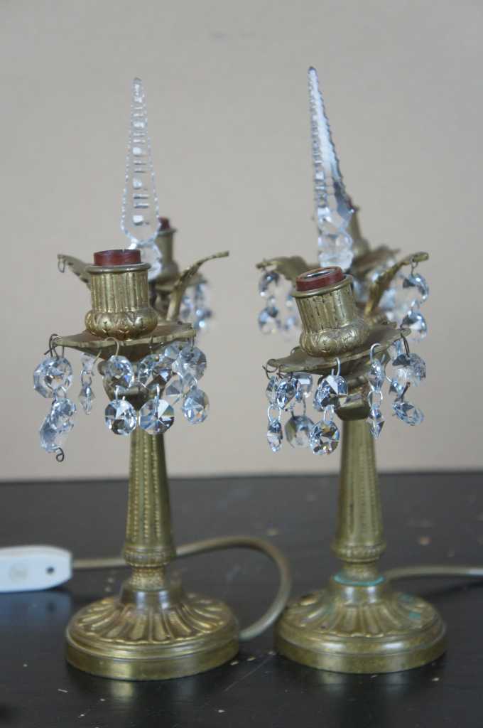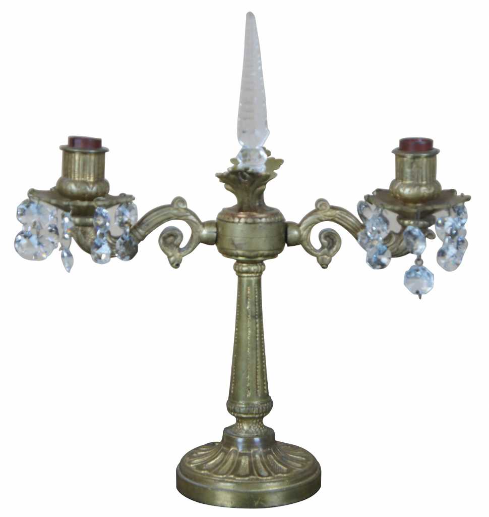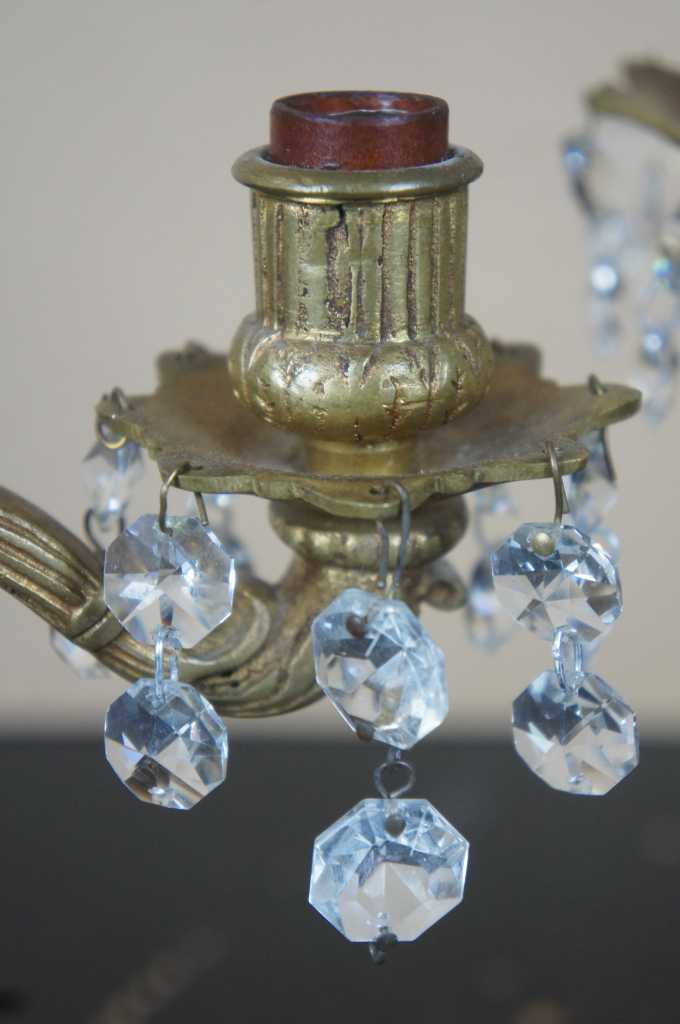 A lovely pair of early 20th century brass converted candelabras. Made from brass with French design featuring scrolled arms and central crystal cut spear finial flanked by floral accents. Additional octagonal drop crystals accent the arms and center. This lamp comes to us from Germany and with European wiring.