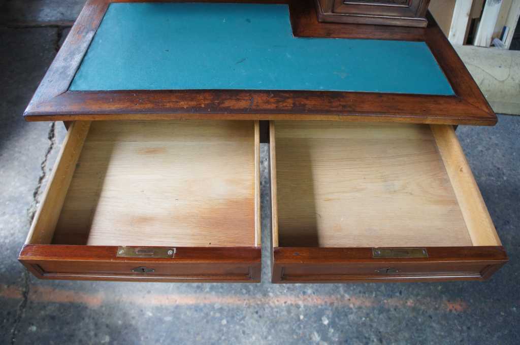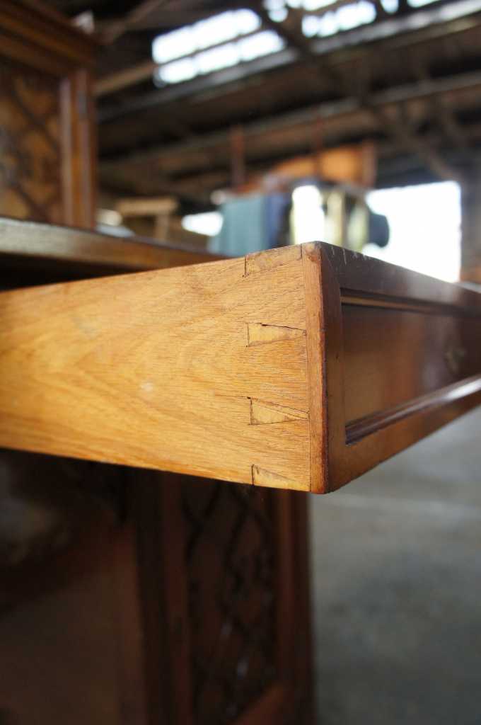 Late 19th century Gothic Revival writing desk. Made from walnut with vinyl inset top and back-splash. This stunning desk is covered in fretwork from the lower and upper gallery to the cabinet doors. Perfect for display and use