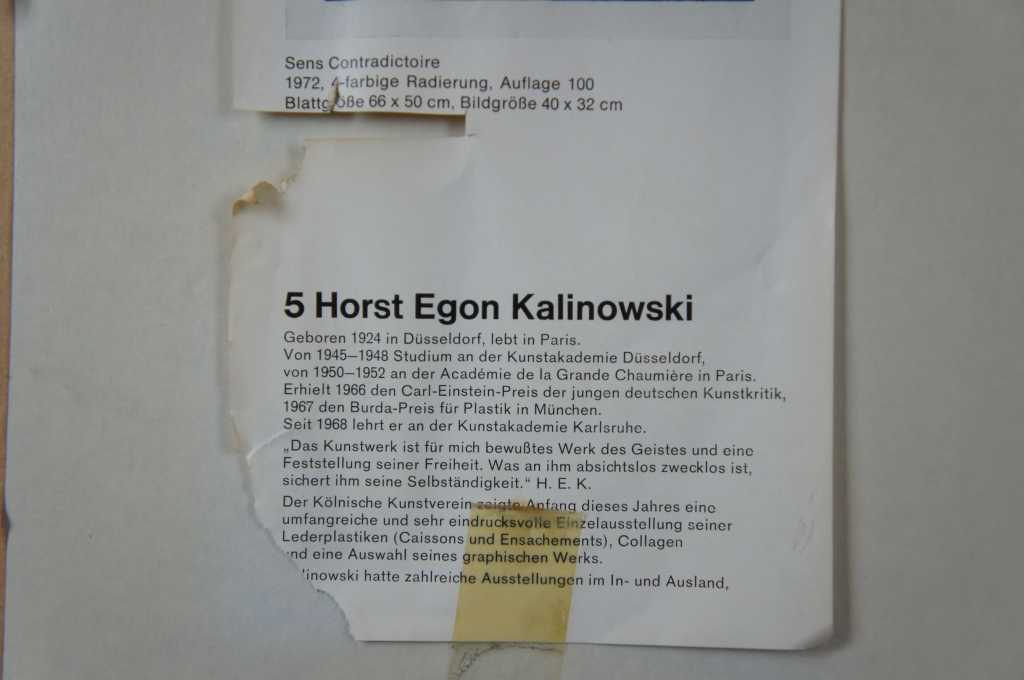 In 1972 Kalinowski became a professor at the Karlsruhe Academy of Fine Arts, a position he held until his retirement. One of the artist’s characteristic features is his experimentation with different materials, which he composed for collages and object boxes.