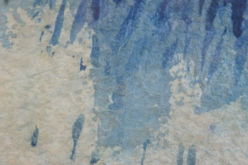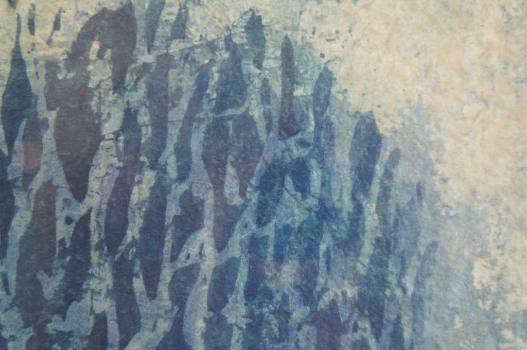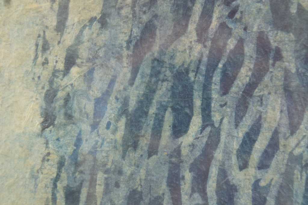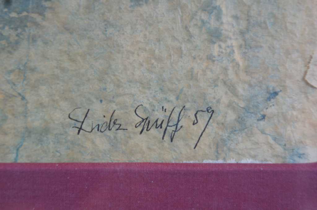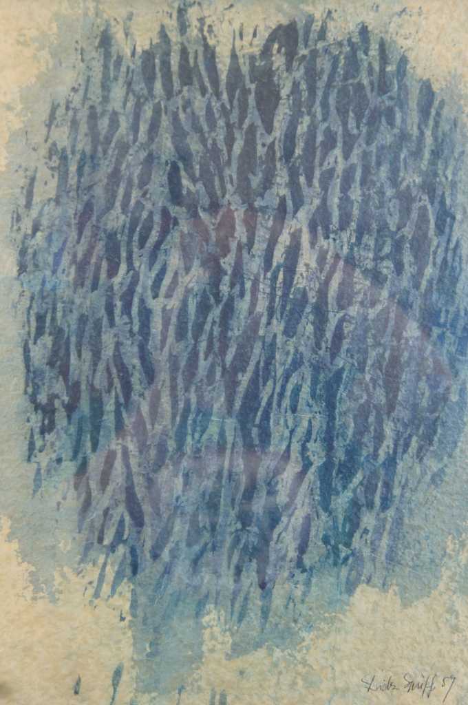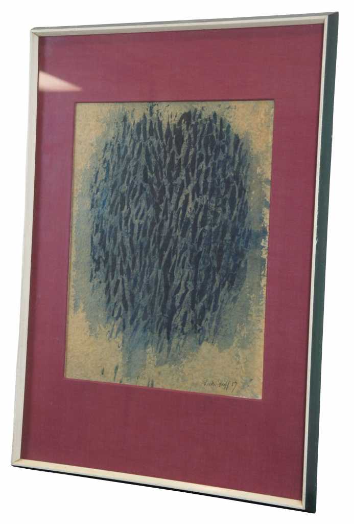 Abstract Watercolor Painting; features watercolor on parchment paper; unable to determin artist signature; came to us from a German collector who moved to the states 30 years ago.
