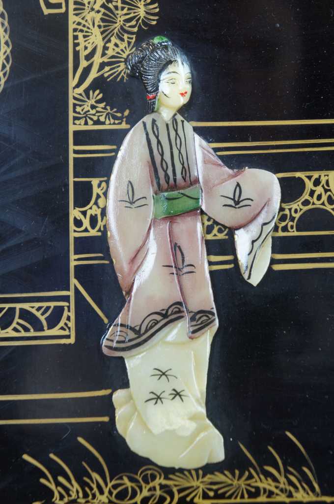 Vintage Soapstone Wall Panel w/ Geishas & Landscape Scene Kimonos Black Lacquor